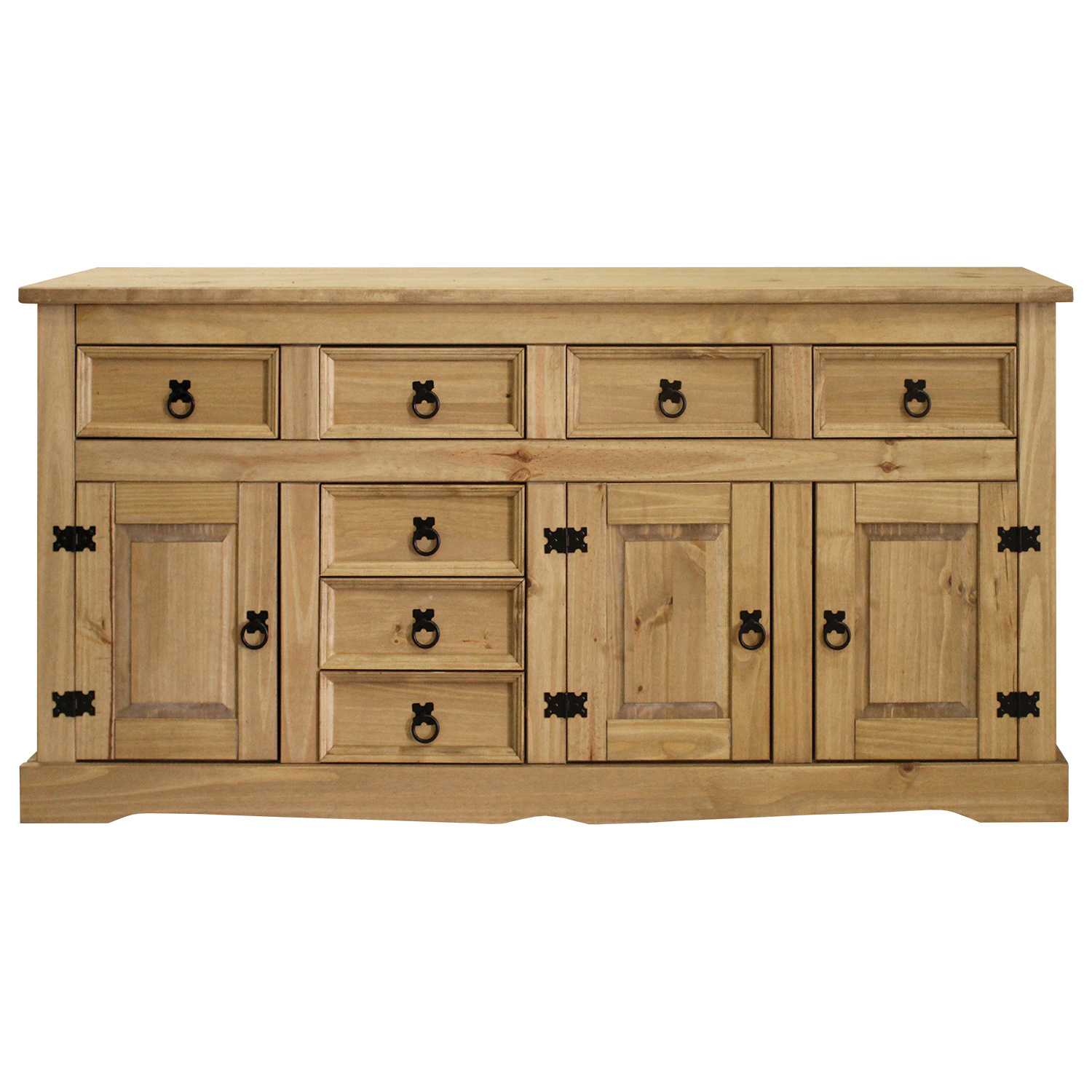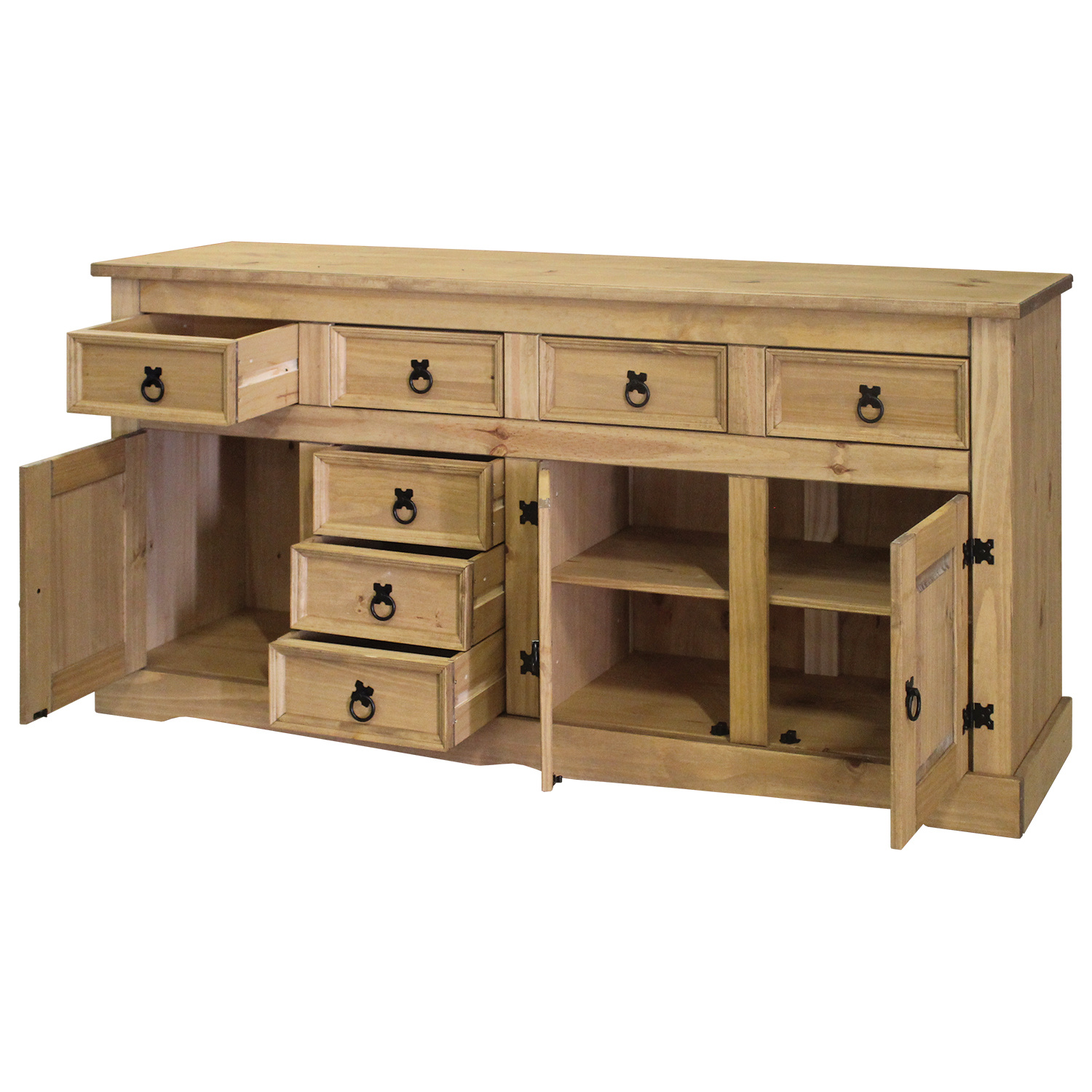 Stylová komoda Corona je vyrobena z masivní borovice, voskovaná v medovém odstínu. Komoda má 3 dvířka, 1 polici a 7 zásuvek. Komodu zdobí černé kovové úchytky. Komoda je součast sestavy Corona. Dekorační transparentní vosky odpuzují vodu a nečistoty. Díky své hloubce má široké využití i v užších prostorech. Zboží dodáváme v demontu.