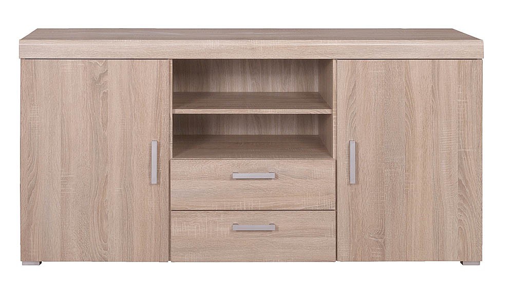 Moderní komoda je vyrobena z kvalitního lamina. Komoda je kombinovaná, má dvoje dvířka a dva šuplíky. Korpus i dvířka jsou vyrobeny v dezénu dub sonoma. Zásuvky mají plnovýsuvné kovové kuličkové pojezdy. Nábytek má plastové úchyty a nožky. Díky eleganci a funkčnosti jednotlivých dílů je vybavení obývacího pokoje nebo pracovny velmi snadnou záležitostí. Nábytek z kolekce VALLES je vyroben s hranou ABS. Je navržen tak, aby i jednotlivě vkusně doplnil výbavu pokojů. Společně pak tvoří elegantní řešení výbavy vašeho bytu. Zboží dodáváme v demontu.