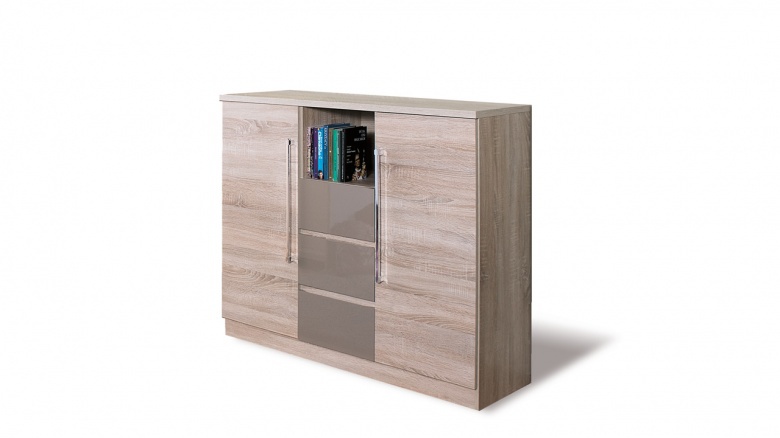 Komoda je vyrobena z laminované dřevotřískové LTD desky opatřena ABS hranou, která zvyšuje odolnost nábytku. Atraktivní barevné provedení dub sonoma a capuccino lesk zefektivní stylový vzhled celé komody. Velká komoda se skládá ze dvou skříněk s plnými dvířky, 3 zásuvek a otevřeného prostoru. Zboží dodáváme v demontu.