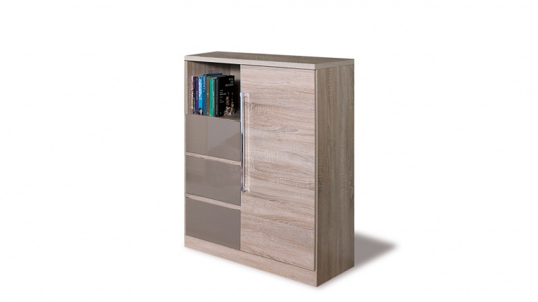 Komoda je vyrobena z laminované dřevotřískové LTD desky opatřena ABS hranou, která zvyšuje odolnost nábytku. Atraktivní barevné provedení dub sonoma a capuccino lesk zefektivní stylový vzhled celé komody. Zboží dodáváme v demontu.