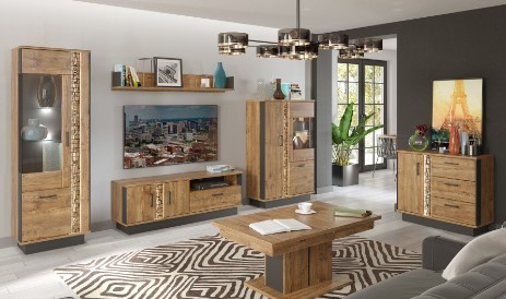 Moderní komoda v provedení dub april/černý. Korpus má vyrobený z lamina o síle 16 mm a MDF o síle 16 mm, ohraněný ABS 0,5 mm / 1,5 mm. Dvířka jsou vyrobeny z MDF o síle 18 mm a jsou potaženy PVC folií. Vrchní desky korpusu jsou vyrobeny z lamina o síle 22 mm. Vnitřní poličky jsou vyrobeny z lamina o síle 16 mm a ABS 0,5 mm. Nohy a úchytky jsou kovové. Zásuvky s kuličkovými pojezdy( GTV) jsou plným výsuvem. Systém tichého dovírání dvířek ve standardu, panty ⌀ 35 mm jsou nastavitelné ve třech osách. Ozdobné rylování je osvětleno LED osvětlením. Zboží je dodáváno v demontu.
