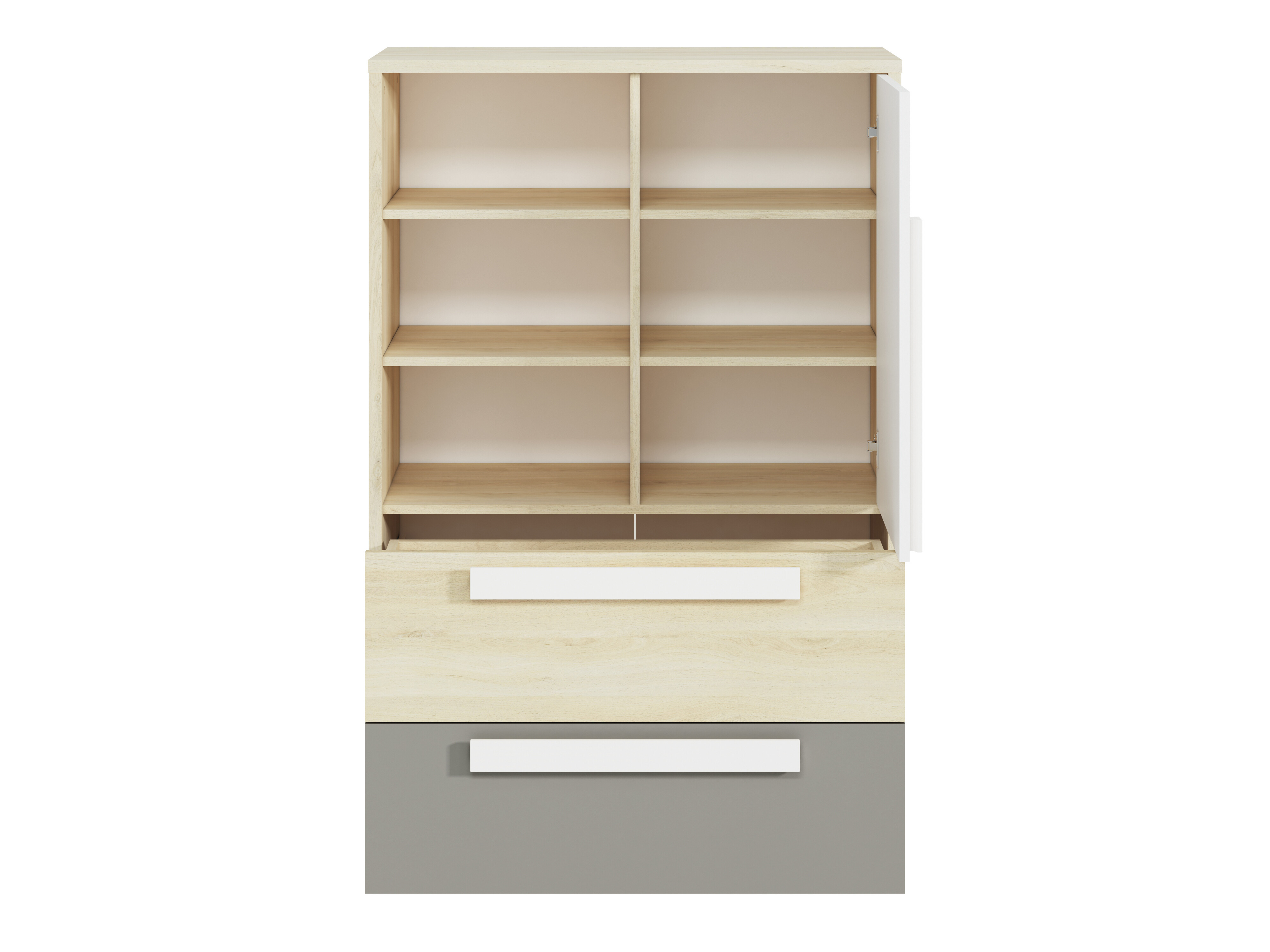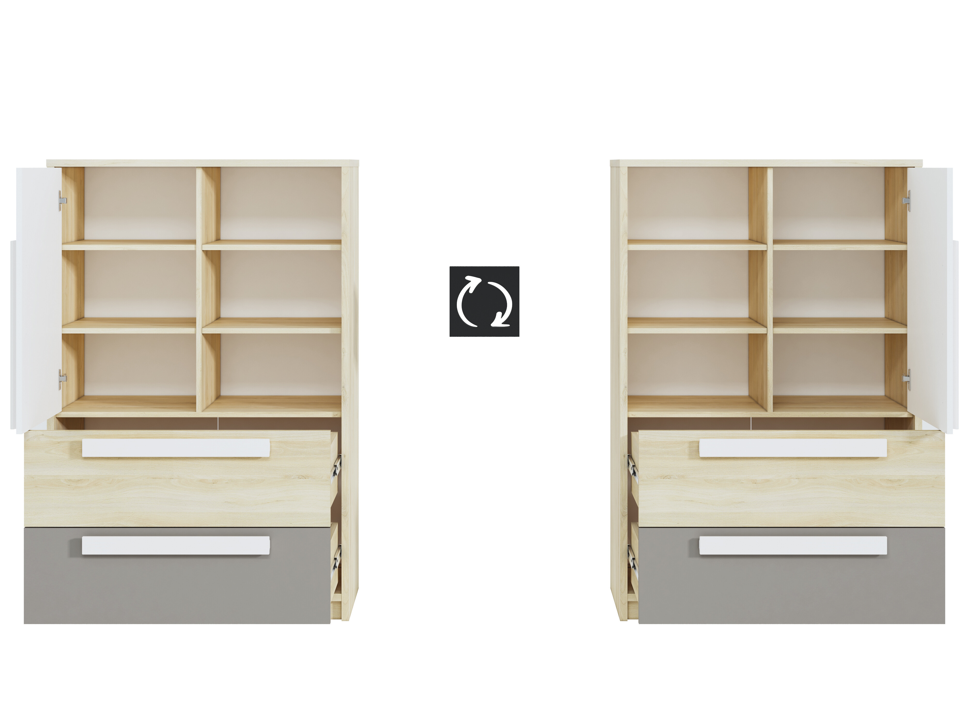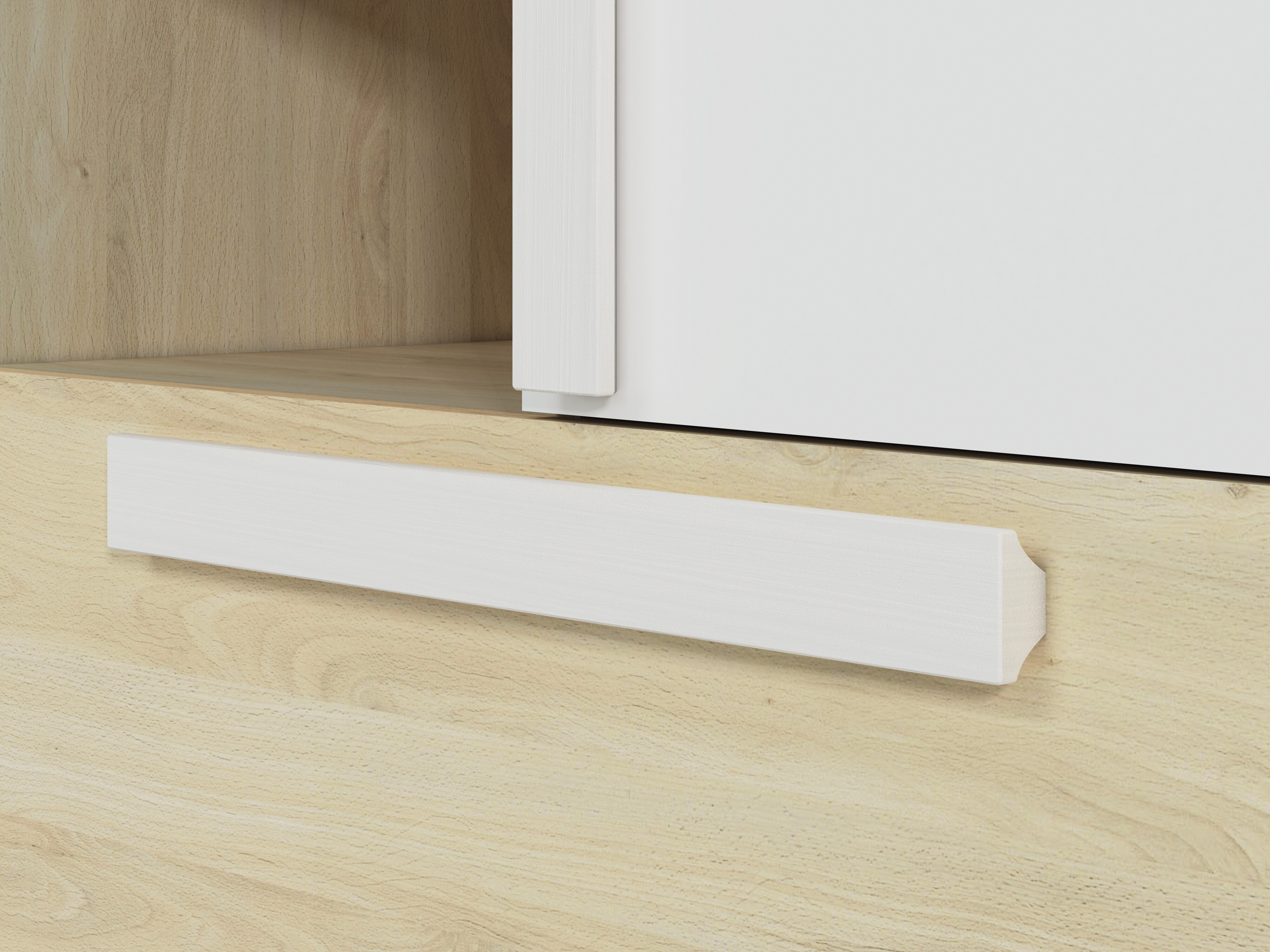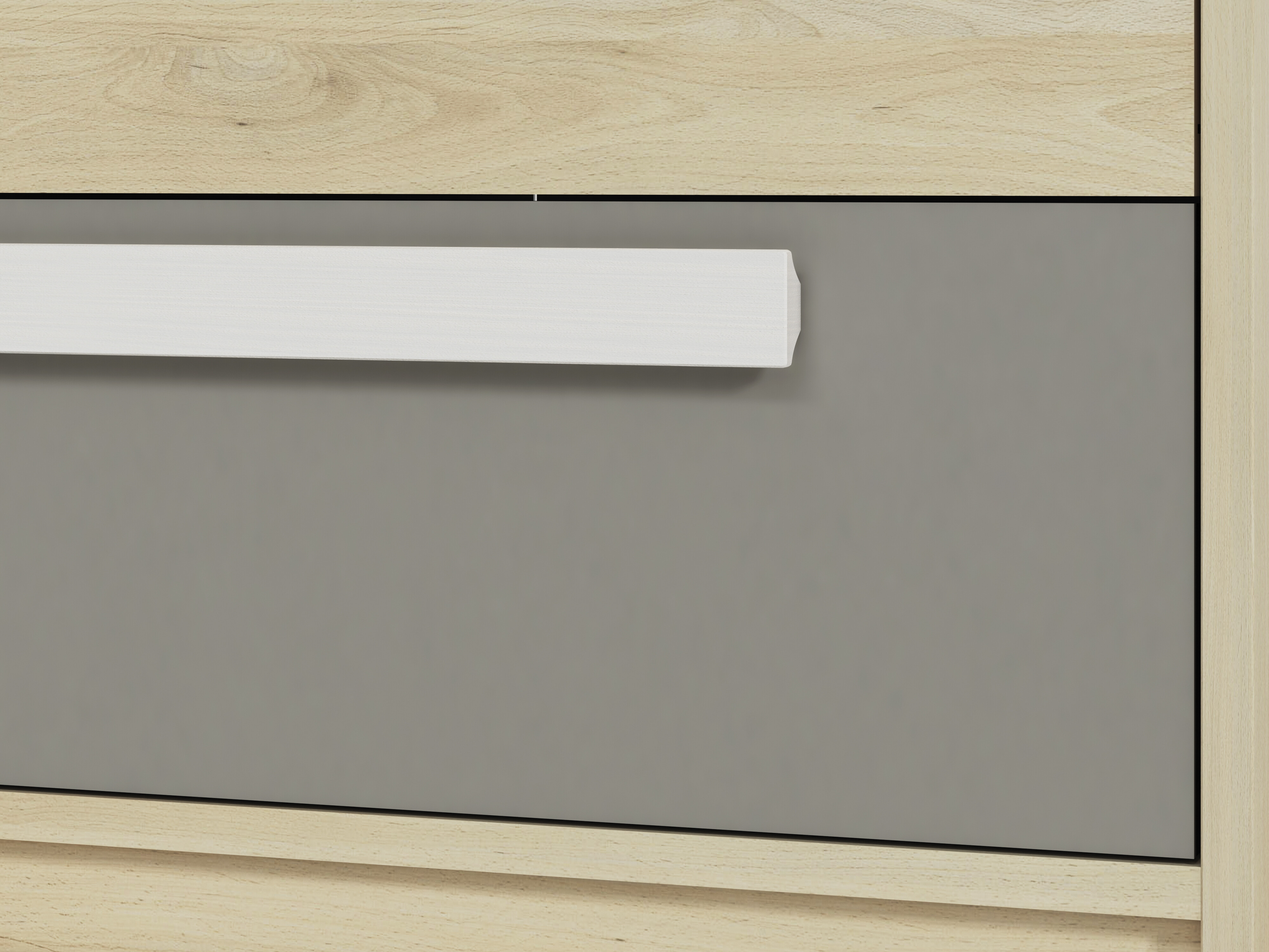 Komoda Drop je vyrobena z kvalitního lamina korpus o korpusy o tl. 22mm, dvířka o tl. 16m s ABS hranami. Korpus je v provedení buk fjord, dvířka bílá a čela šuplíku buk fjord/šedá platina. Úchyty jsou dřevěné. Zboží je dodáváno v demontu.