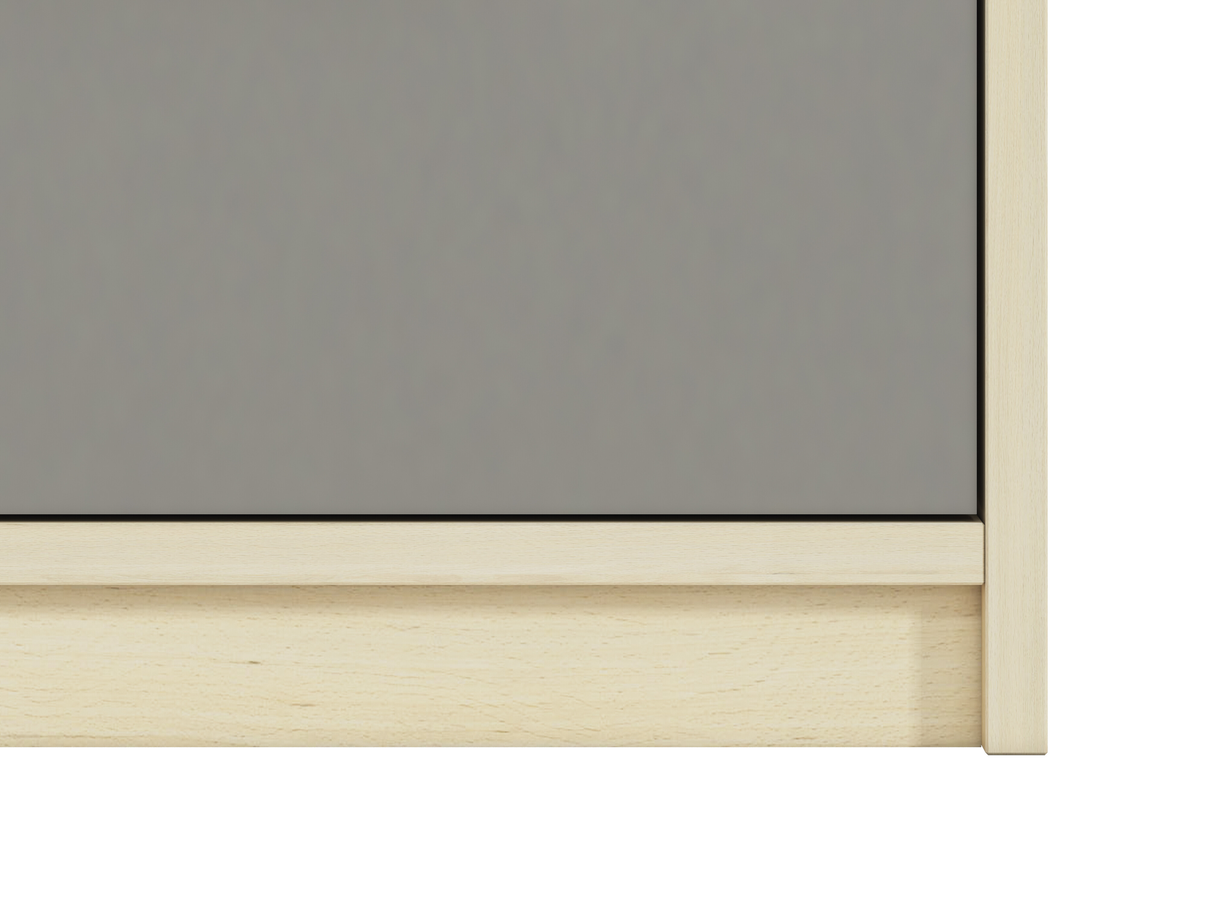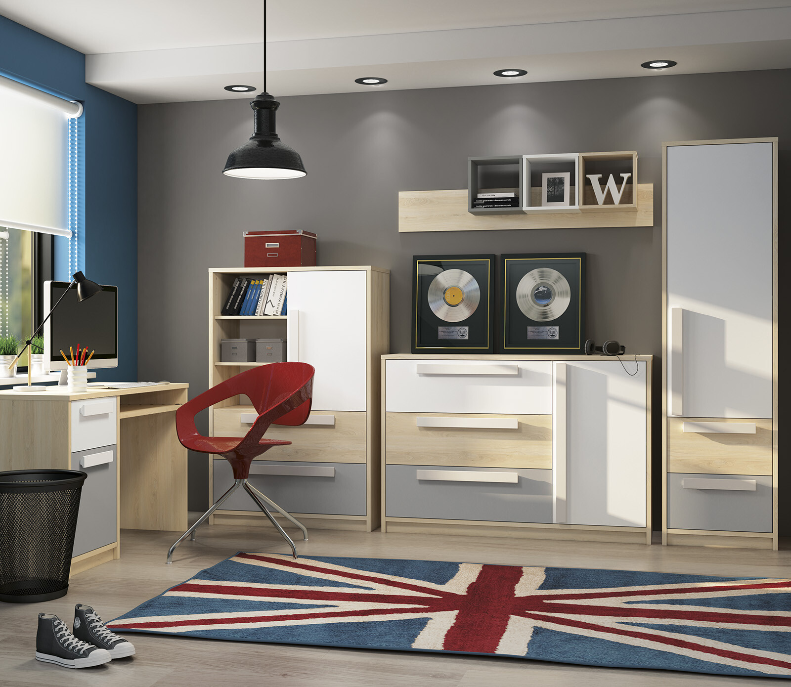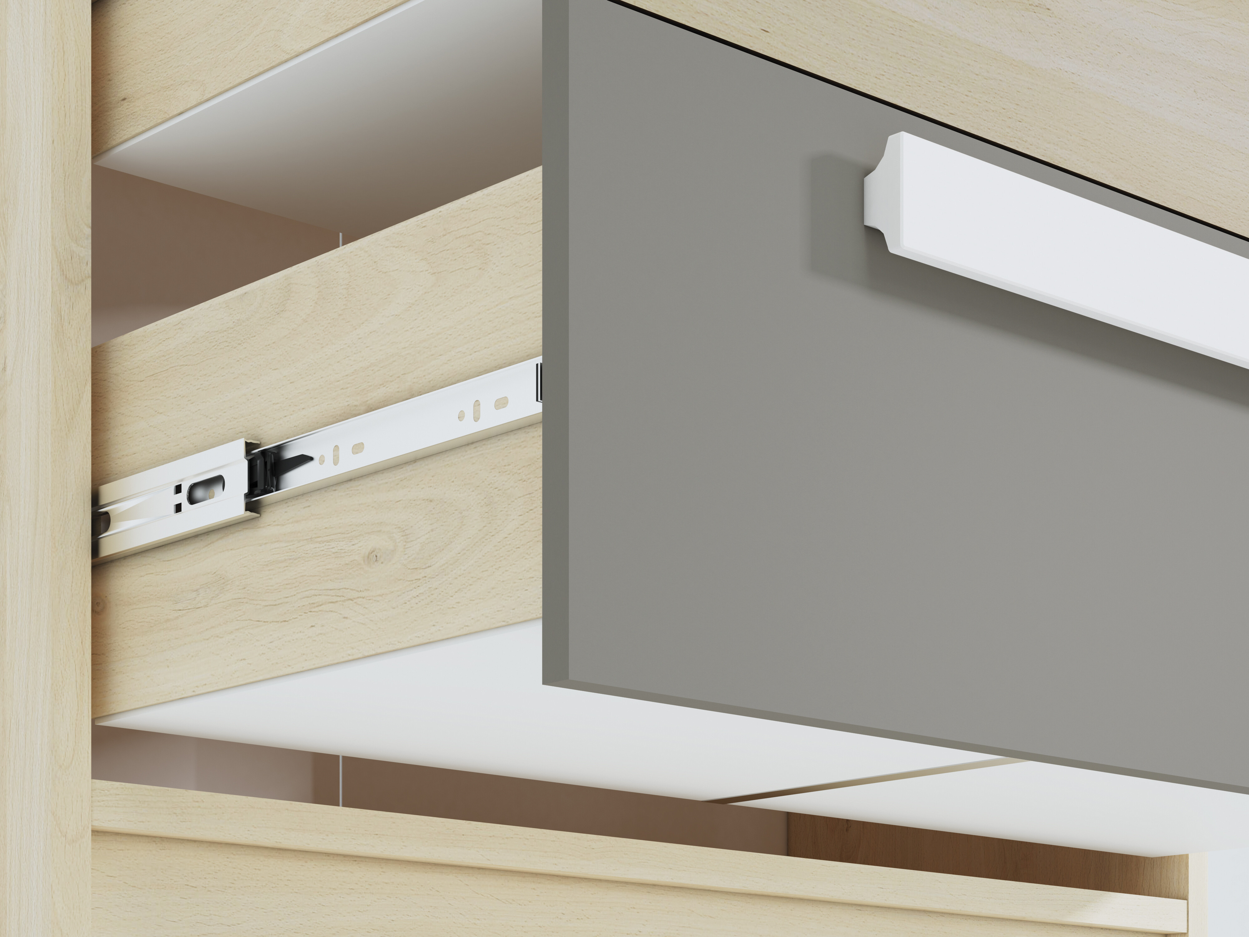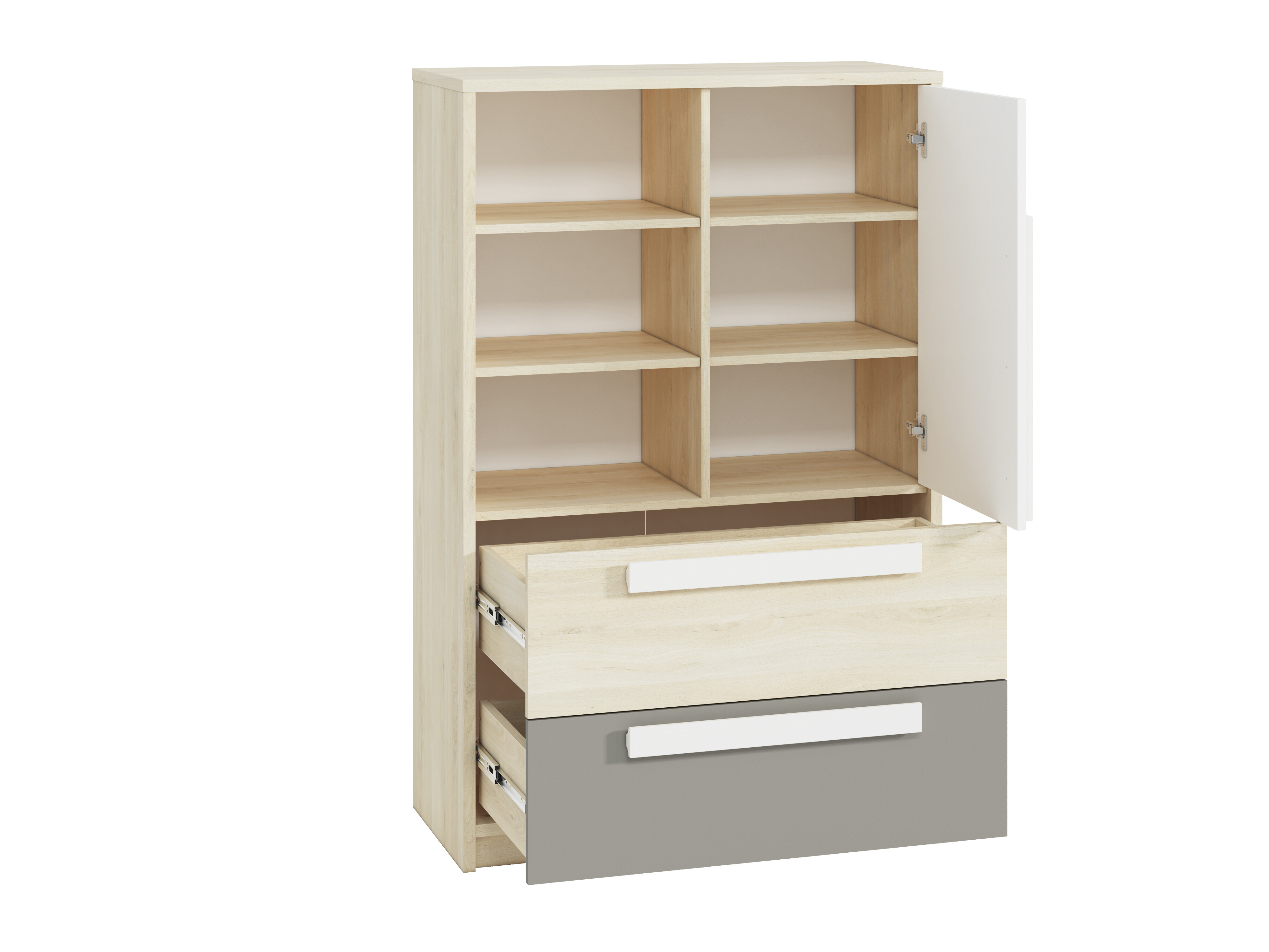 Komoda Drop je vyrobena z kvalitního lamina korpus o korpusy o tl. 22mm, dvířka o tl. 16m s ABS hranami. Korpus je v provedení buk fjord, dvířka bílá a čela šuplíku buk fjord/šedá platina. Úchyty jsou dřevěné. Zboží je dodáváno v demontu.