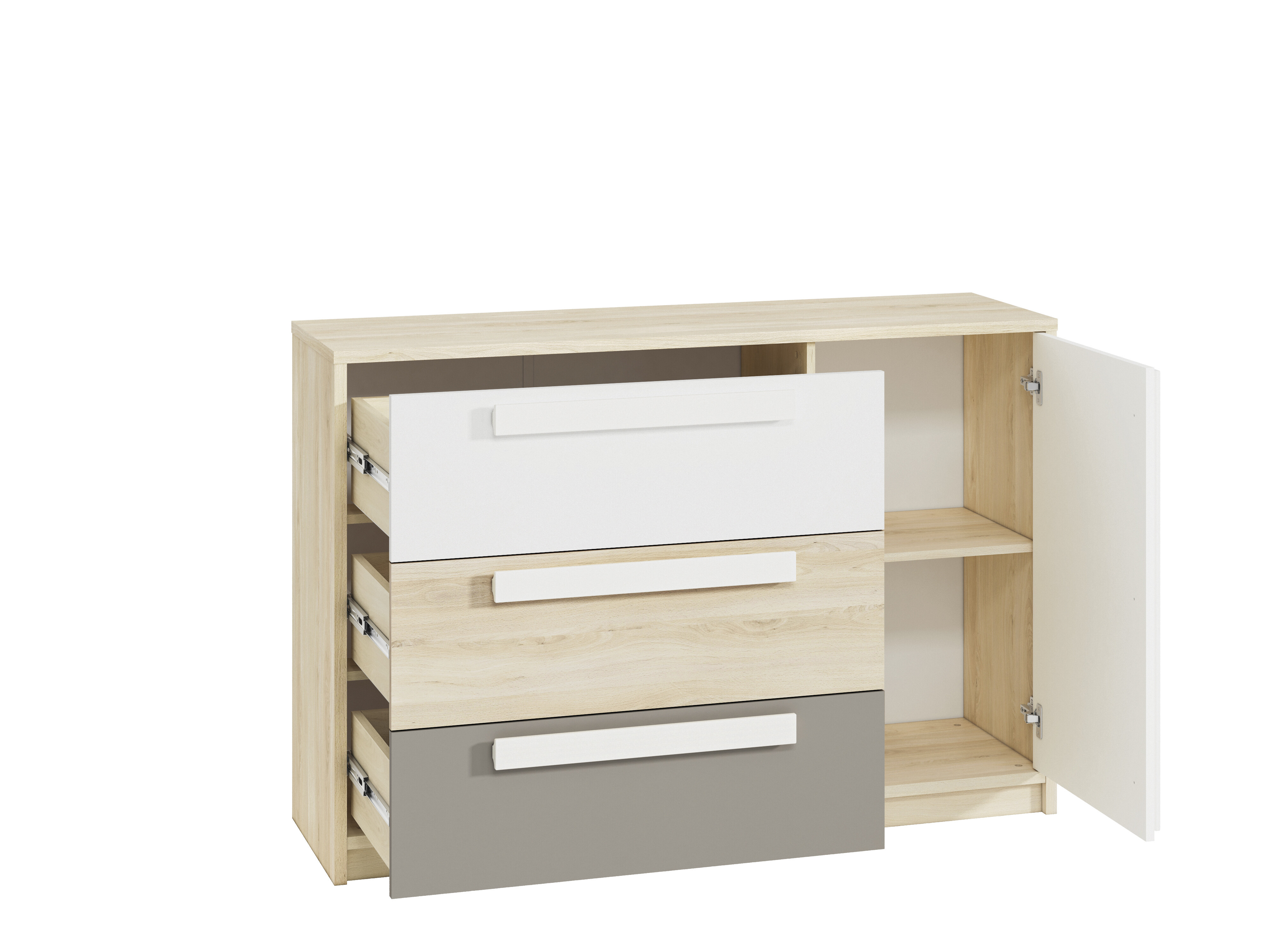 Komoda Drop je vyrobena z kvalitního lamina korpus o korpusy o tl. 22mm, dvířka o tl. 16m s ABS hranami. Korpus je v provedení buk fjord a dvířka a čela šuplíku bílá/buk fjord/šedá platina. Úchyty jsou dřevěné. Zboží je dodáváno v demontu.