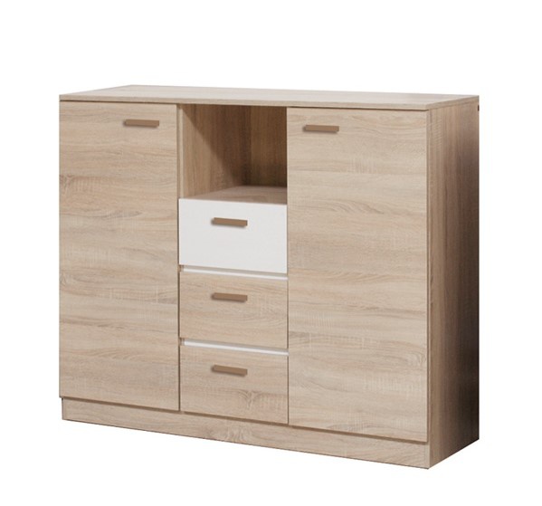 Moderní a praktická komoda je vyrobena z kvalitní laminované LTD desky v dezénu dub sonoma. Ozdobný dekorativní prvek je v barvě bílá andersen. Komoda má dvoje dvířka po stranách a tři šuplíky uprostřed. Ke komodě je možno dokoupit šatní skříň EFFECT EF2-200. Zboží je dodáváno v demontu.