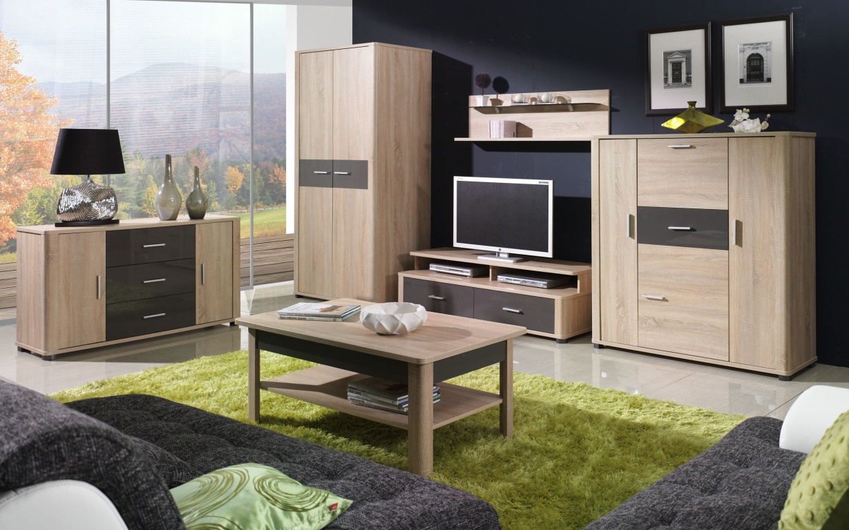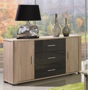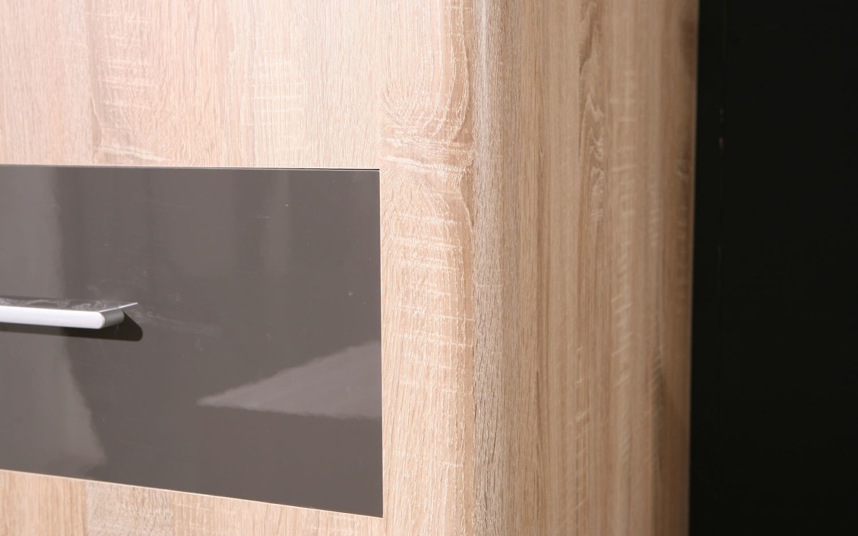 Komoda je vyrobena z materiálu LTD, má zaoblené hrany. Korpus je v dezénu dub sonoma a dvířka v barvě dub sonoma/grafit lesk. Úchytky jsou plastové v barvě stříbra. Zboží je dodáváno v demontu.
