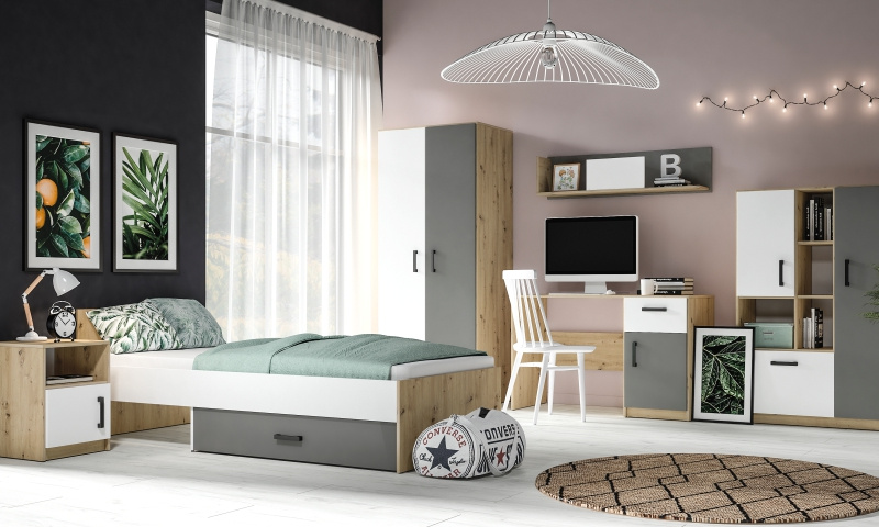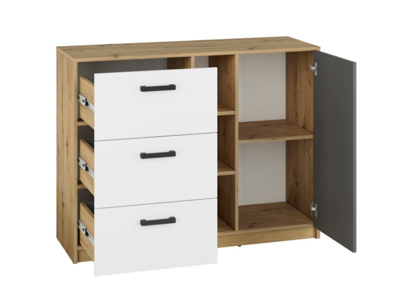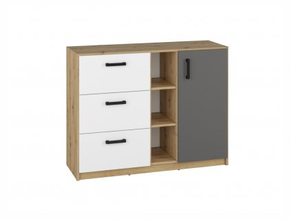 Komoda FINI 06 je součástí systémového nábytku FINI ale lze ji použít i samostatně nebo k jinému nábytku. Konstrukce a přední díly jsou vyrobeny z kvalitního a odolného lamina v dekoru dřeva v kombinaci s bílou a antracitovou barvou. Úchytky jsou plastové v černé barvě.