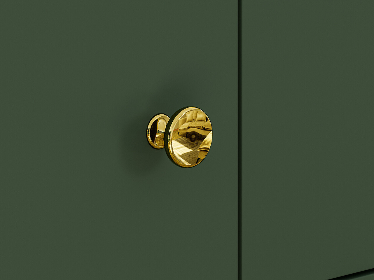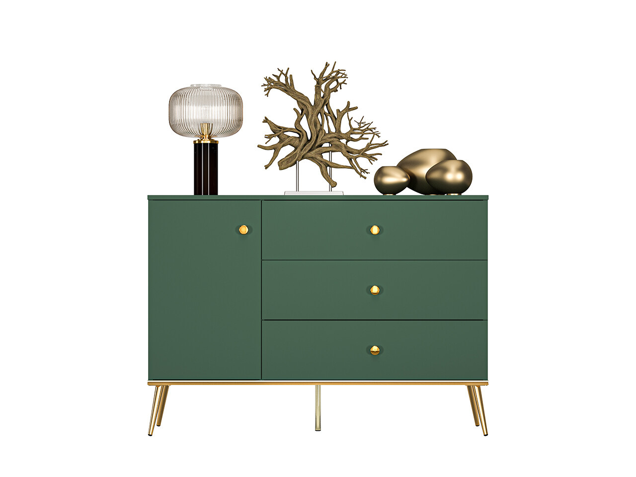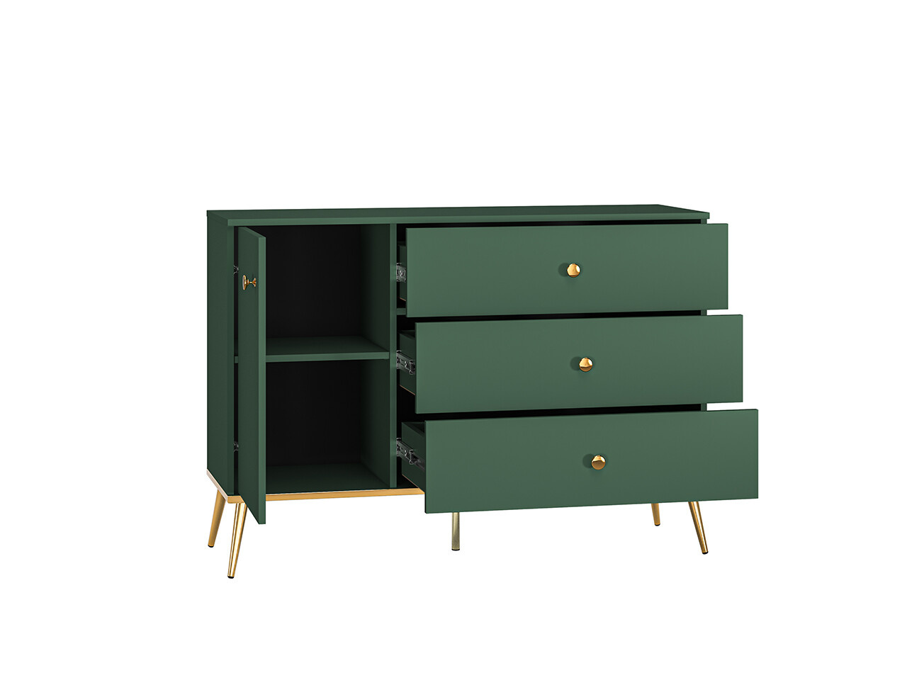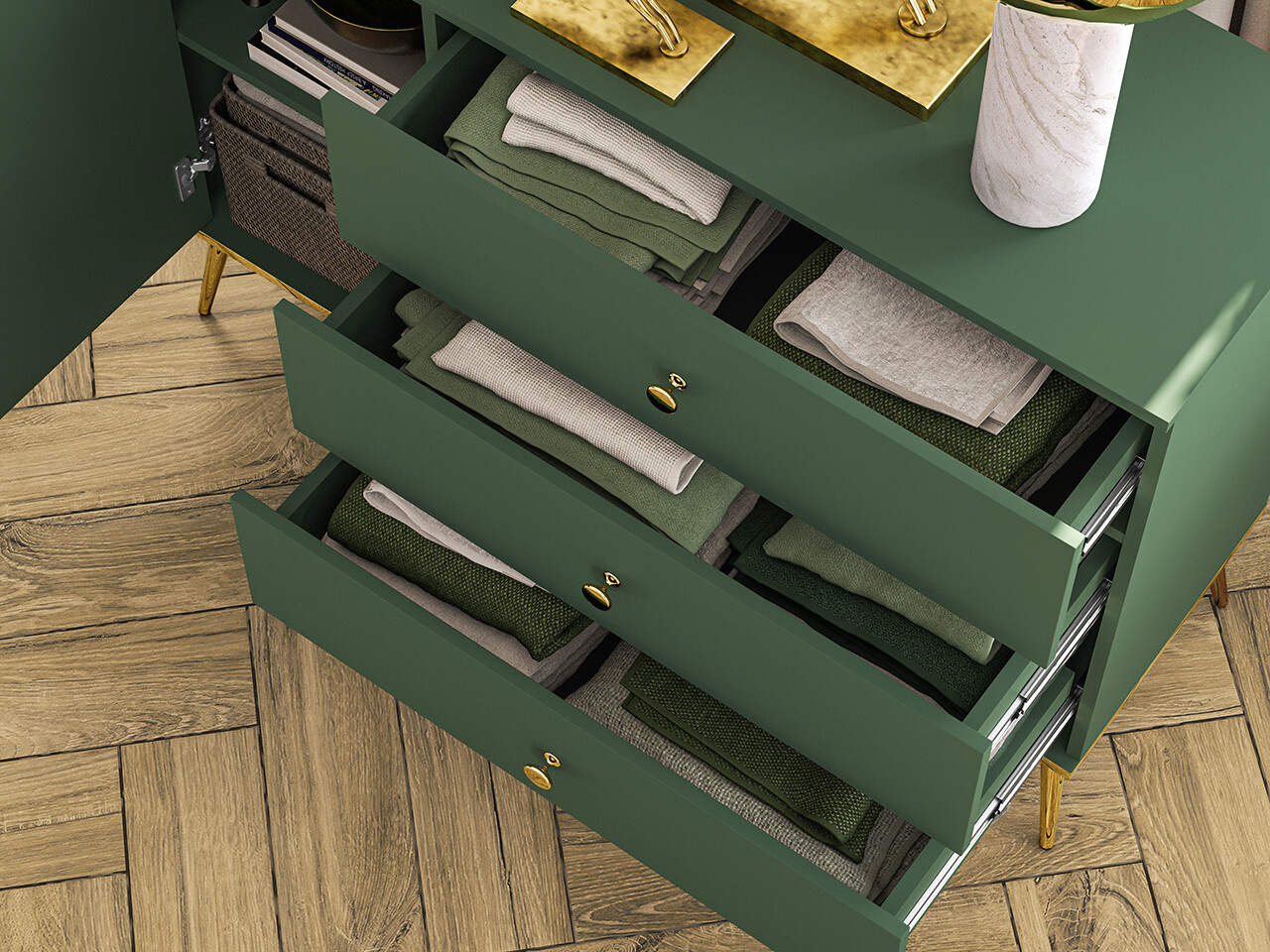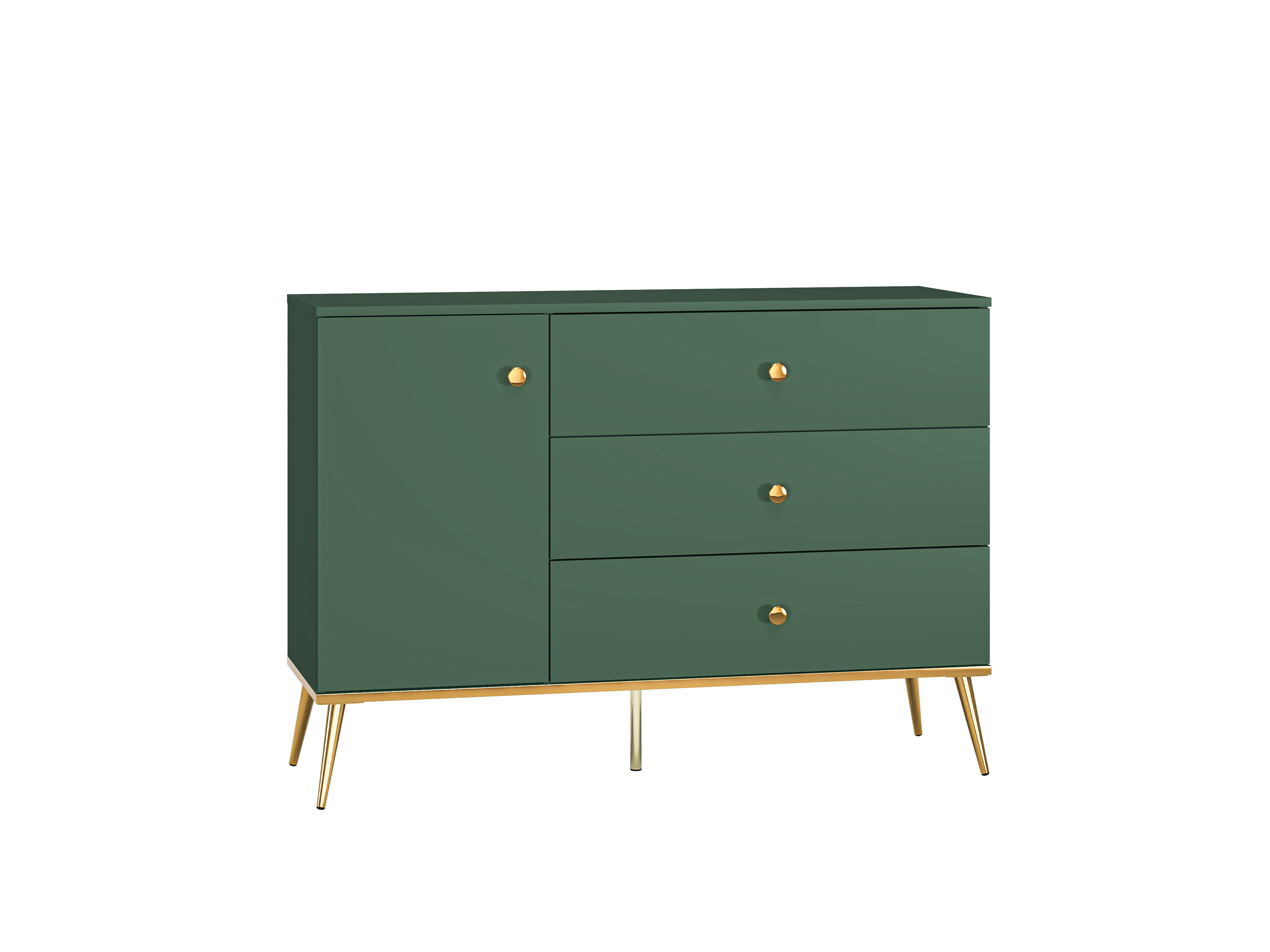 Komoda Forest je vyrobena z vysoce kvalitní laminované dřevotřískové desky s ABS hranou v barevném provedení zelená v matném provedení. Nábytek stojí na vysokých kovových zlatých nožkách. ÚIchytky jsou kovové ve zlaté barvě. Zboží dodáváme v demontu.