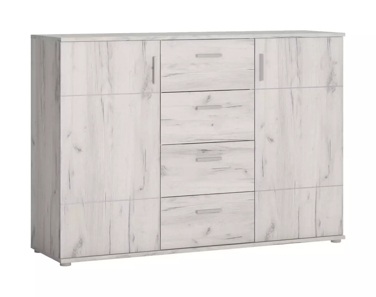 Komoda dvoudvéřová se čtyřmi šuplíky je vyrobena z materiálu lamino v dezénu dub craft bílý. Úchytky jsou v barvě chrom. V částech komody s dvířky se nacházejí police. Zboží je dodáváno v demontu.