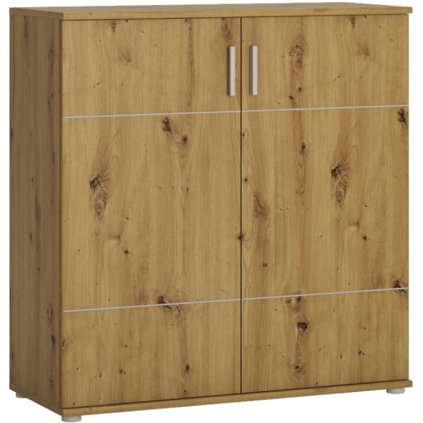 Komoda dvoudvéřová je vyrobena z materiálu lamino v dezénu dub artisan. Úchytky jsou v barvě chrom. Uvnitř komody se nacházejí dvě police. Zboží je dodáváno v demontu.