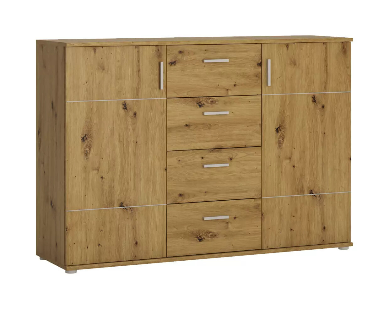 Komoda dvoudvéřová se čtyřmi šuplíky je vyrobena z materiálu lamino v dezénu dub artisan. Úchytky jsou v barvě chrom. V částech komody s dvířky se nacházejí police. Zboží je dodáváno v demontu.