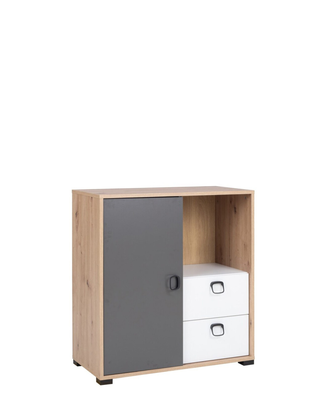 Komoda ze systému Kevin má konstrukci z lamina, tl. 16 mm a hrany ABS 0,6 mm. Konstrukce v dekoru dub artisan, přední díly v dekoru dub artisan/grafit/ bílý mat. Komoda má členění vlevo 1x dvířka, uvnitř 1x police, vpravo 1x otevřená police, 2x zásuvka. Úchytky jsou kovové v černé barvě. Zboží dodáváme v demontu.