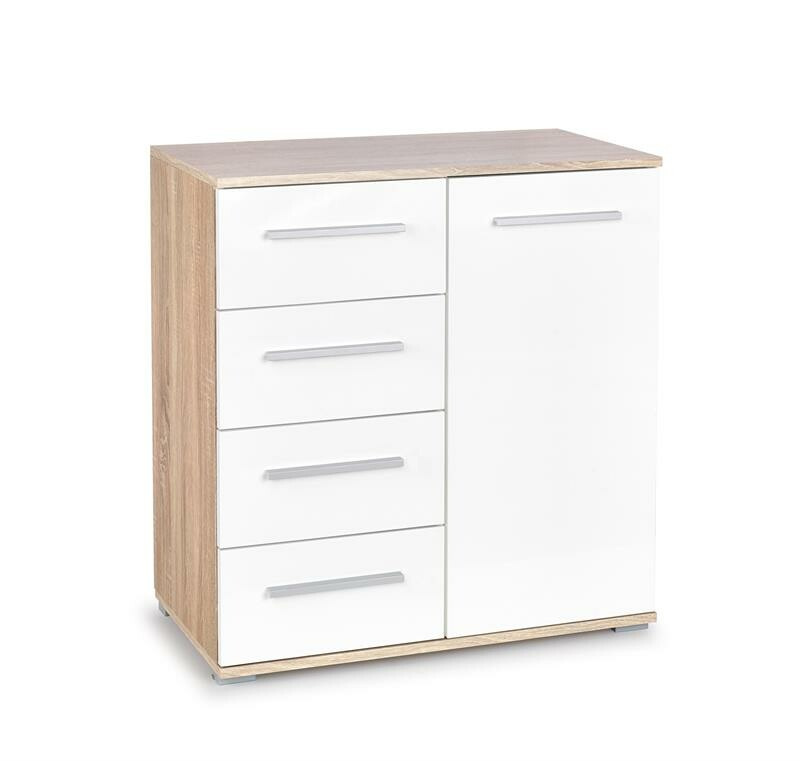Komoda Lima je vyrobena z kvalitního lamina. Korpus komody je v dezénu dub sonoma. Dvířka a čela šuplíků jsou v barvě bílý lesk. Komoda Lima má ABS hrany. Úchytky jsou v barvě chrom. Zboží je dodáváno v demontu.