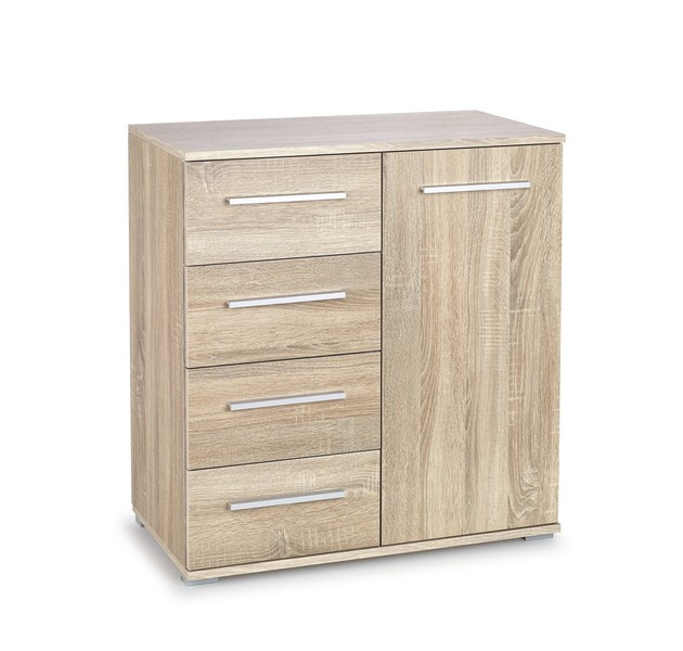 Komoda je vyrobena z materiálu lamino/lak s hranami ABS v barvě dub sonoma. Komoda obsahuje čtyři zásuvky a jednodveřovou skříňku s jednou policí. Stylová moderní komoda dodá vašemu interiéru velmi zajímavý vzhled, a to především díky příjemnému designu. Zboží dodáváme v demontu.