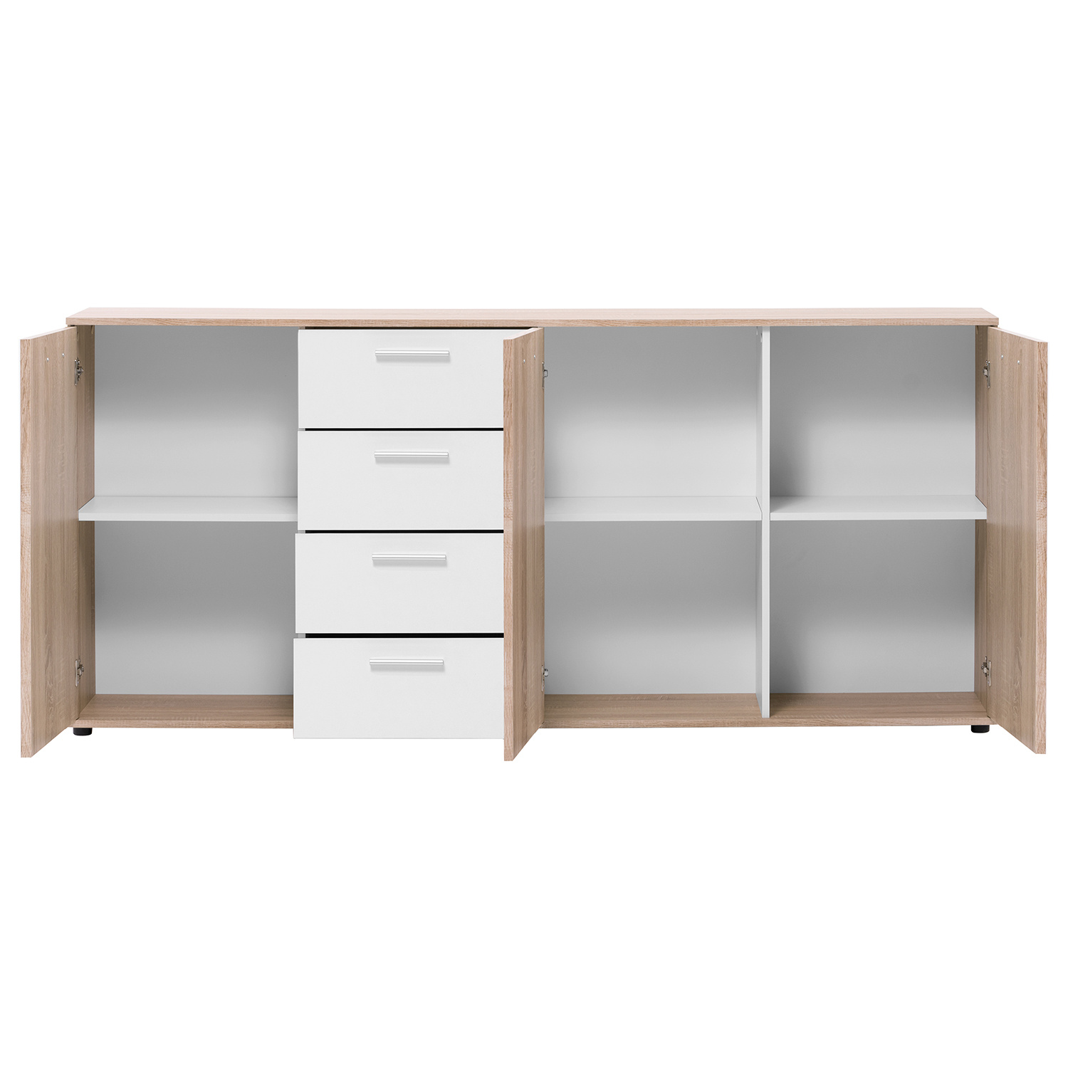Komoda z lamina v barevném provedení dub sonoma/bílá. Komoda má 4 zásuvky s kovovými pojezdy, 3 dvířka se 3 variabilními policemi. Zboží dodáváme v demontu.