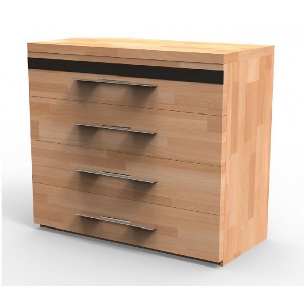 Moderní komoda je vyrobena z masivu v barevném provedení buk cink(parketový desing) o tloušťce 40/27 mm. Má 4velké zásuvky. Běžně se vyrábí bez skla.Možnost výběru skla : BS-bílé sklo, ČS - černé sklo, MS - mocca sklo za příplatek 910,-Kč. Zboží dodáváme v demontu.