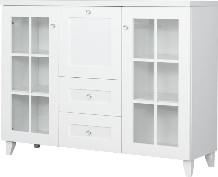 Elegantní komoda s praktickým barem, dvěma zásuvkami a dvěma bočními prosklenými dvířky v bílé barvě. Zboží je dodáváno v demontu.