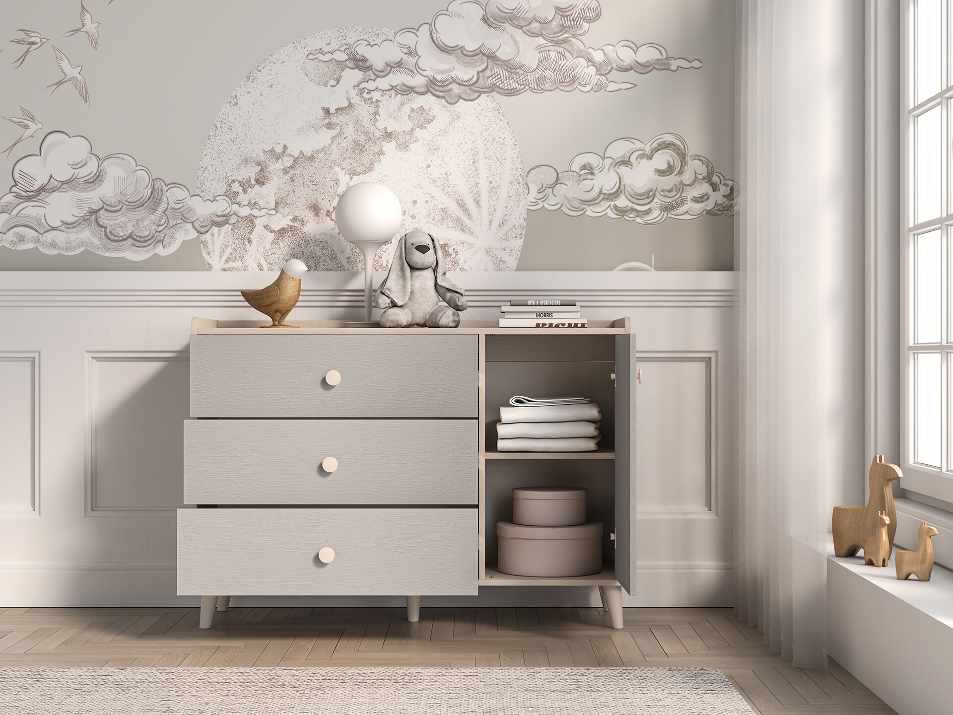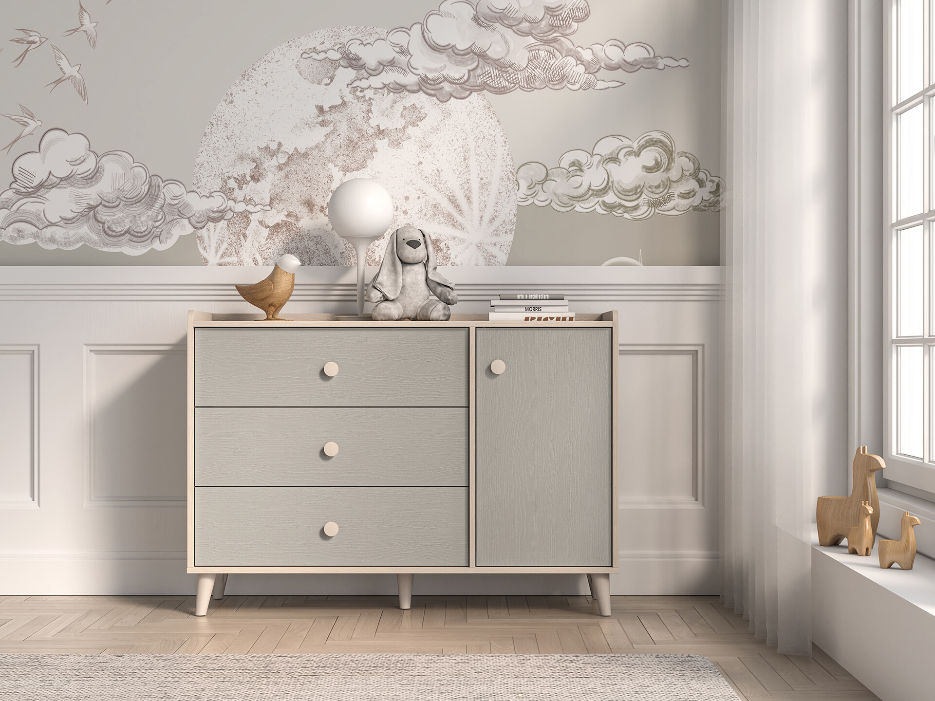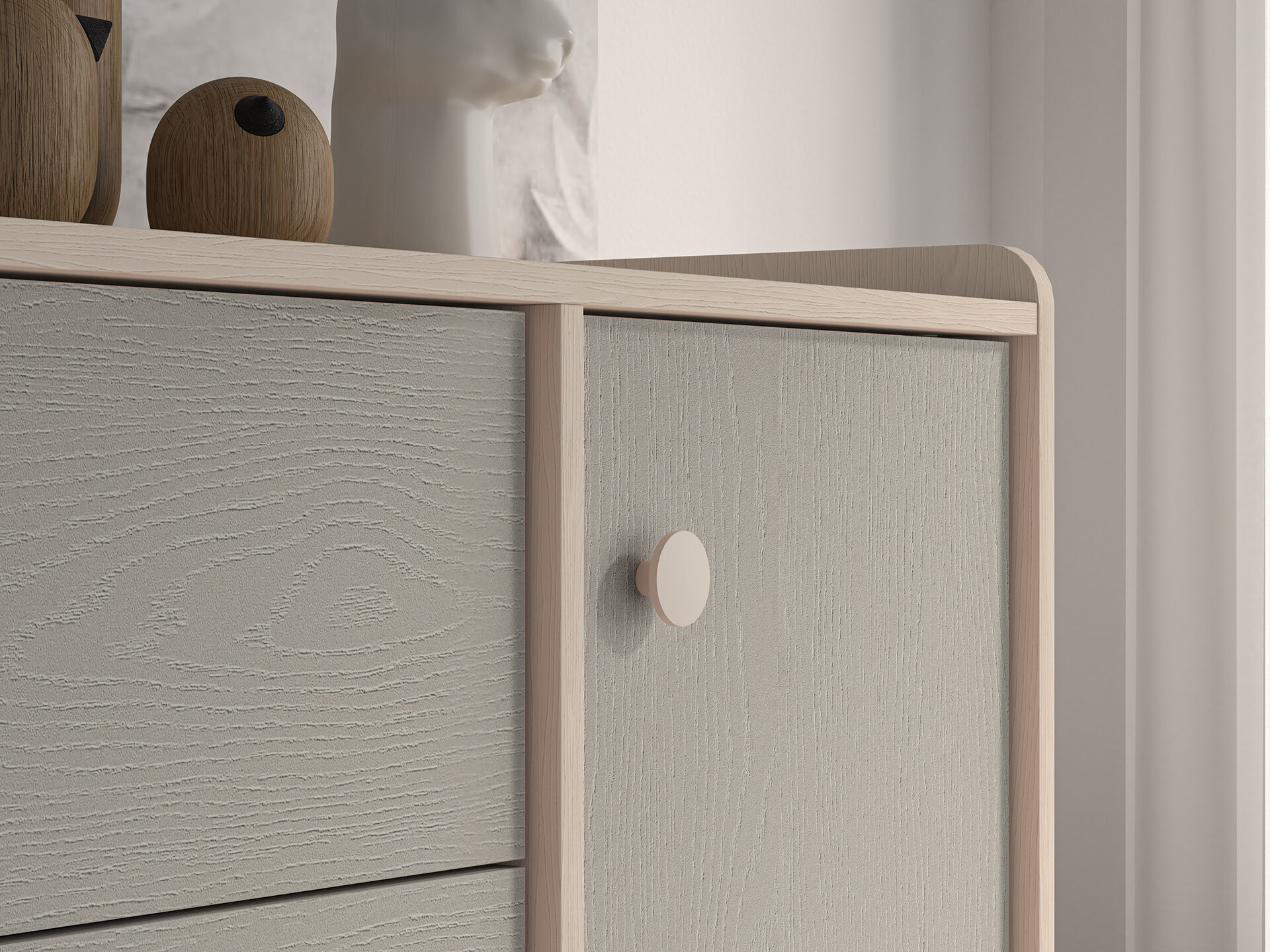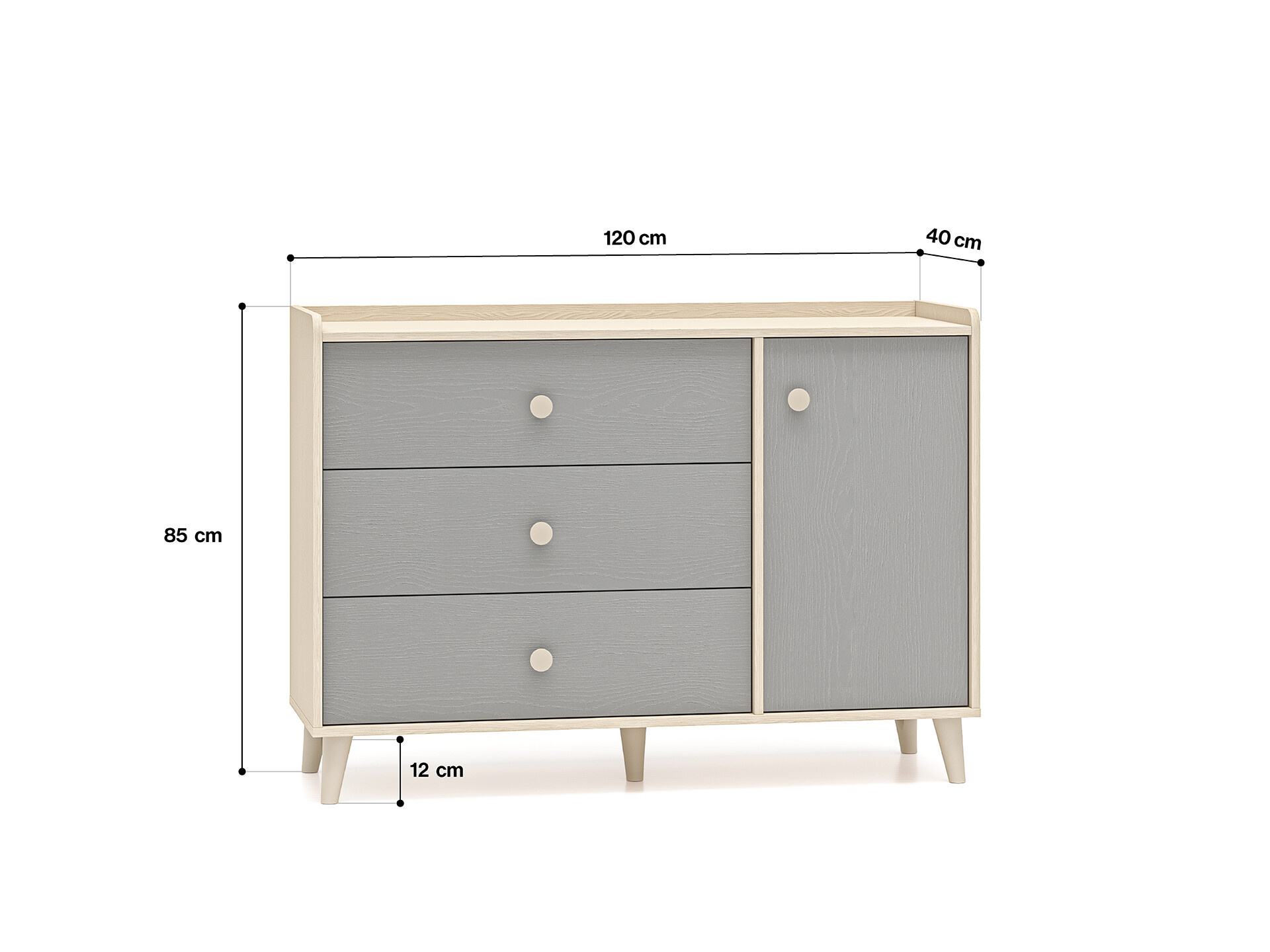 Komoda Mevel je vyrobena z vysoce kvalitní laminované dřevotřískové desky s ABS hranou v elegatní kombinaci béžového ( pískového) korpsu a šedých (palland) dvířek v matném provedení. Dvířka s tichým dovíráním, pro bezpečné a tiché otevírání, s béžovými kulatými úchyty. Nosnost jedné police 10 kg. Zboží dodáváme v demontu.