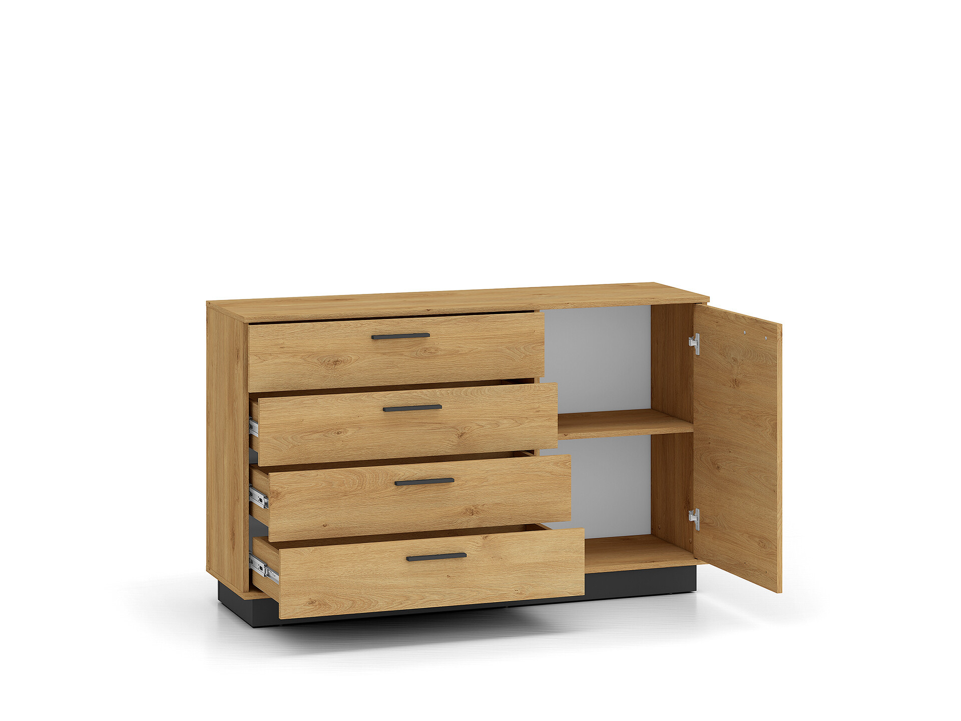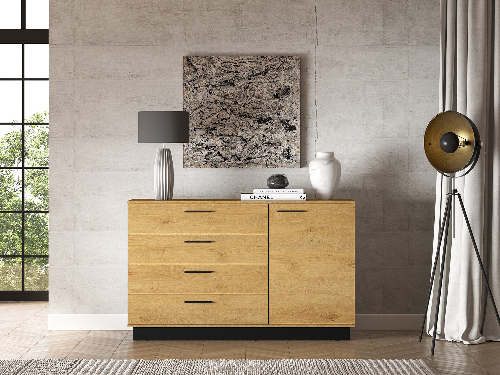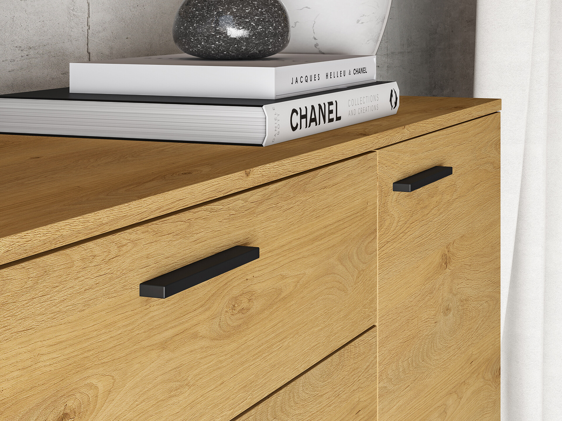 Komoda Modesto je vyrobena z vysoce kvalitní laminované dřevotřískové desky s ABS hranou v provedení dub stylový/ černá. Zboží dodáváme v demontu.