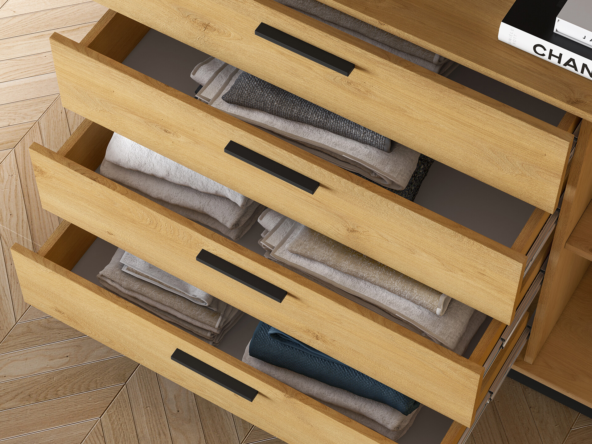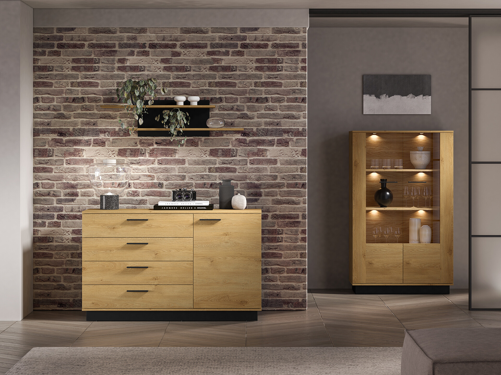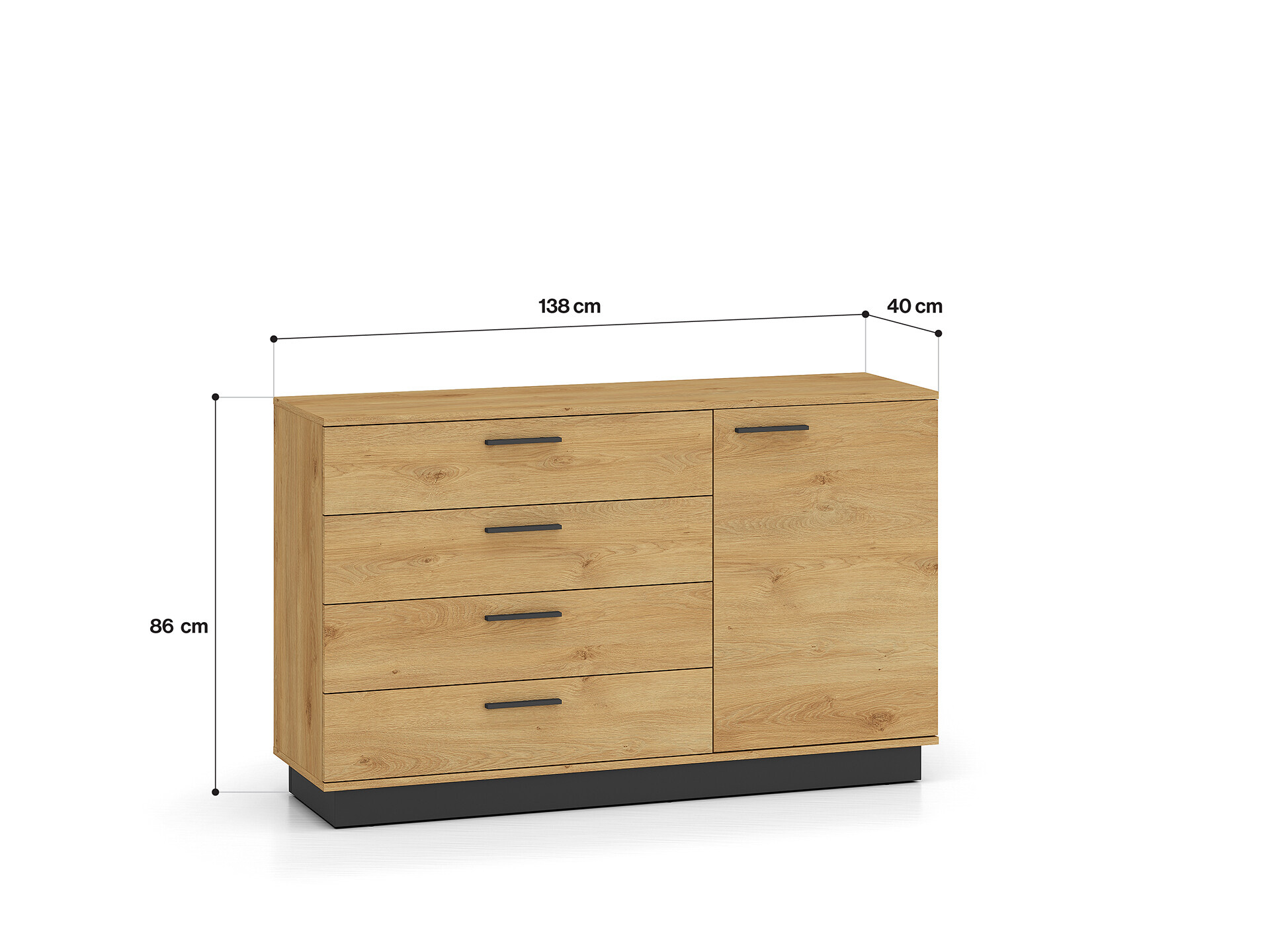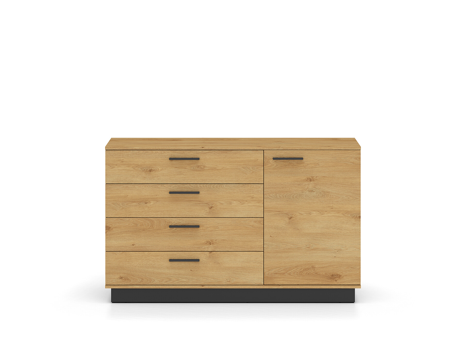 Komoda Modesto je vyrobena z vysoce kvalitní laminované dřevotřískové desky s ABS hranou v provedení dub stylový/ černá. Zboží dodáváme v demontu.