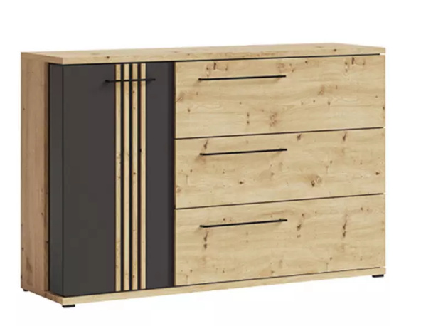 Moderní komoda Molto je vyrobena z kvalitního a odolného lamina, v kombinaci dezénu dub artisan/černá mat. Tato komoda má mnoho úložného prostoru. Úchytky v černé barvě. Zboží dodáváme v demontu.
