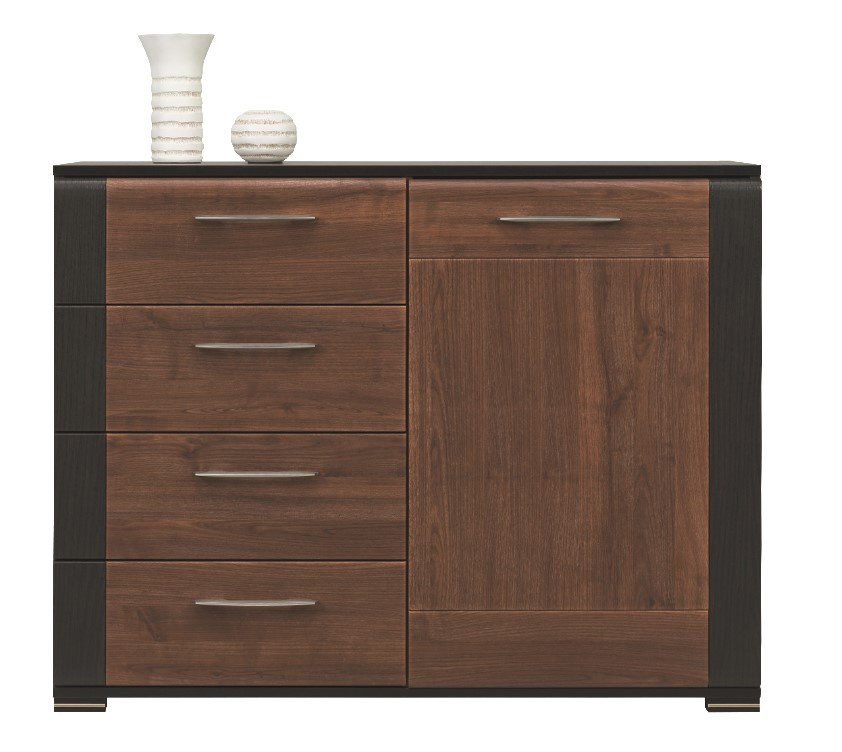 Komoda má korpus vyroben z vysoce kvalitní laminované desky v barvě ořechu. Dvířka a čela šuplíků jsou z MDF potažené PVC fólií v kombinaci ořech/wenge. Nábytek Naomi má komfortní kovové úchytky a dřevěné nožky s chromovou vložkou. Tiché dovírání dvířek jako standard. Zboží je dodáváno v demontu.