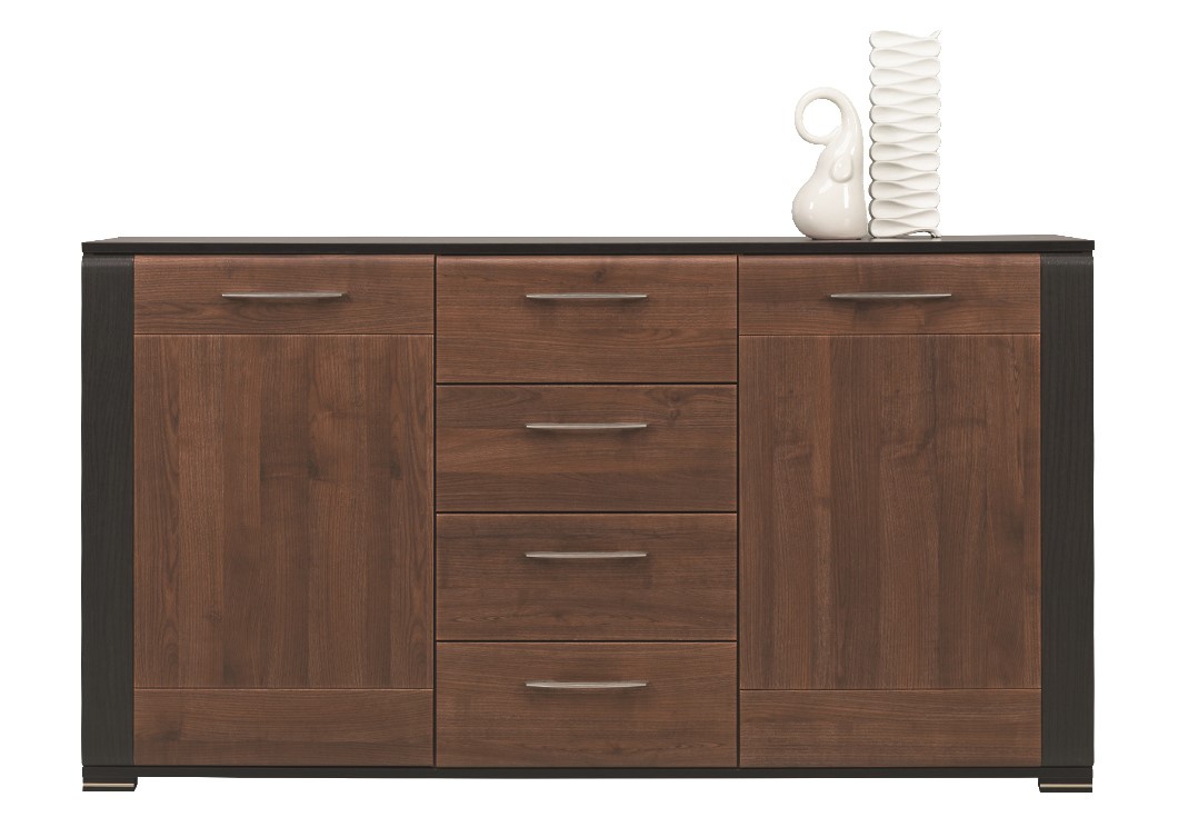 Komoda má korpus vyroben z vysoce kvalitní laminované desky v barvě ořechu. Dvířka a čela šuplíků jsou z MDF potažené PVC fólií v kombinaci ořech/wenge. Nábytek Naomi má komfortní kovové úchytky a dřevěné nožky s chromovou vložkou. Tiché dovírání dvířek jako standard. Možno doobjednat tiché dovírání zásuvek (na dotaz). Zboží je dodáváno v demontu.