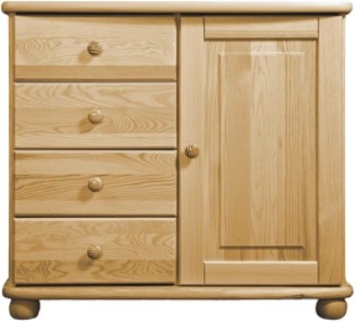 Komoda je vyrobená z borovicového masivu, který je ošetřen dvěma vrstvami bezbarvého ekologického laku. Tyto solitéry jsou celomasivní, tzn. všechny části jsou vyrobeny z přírodního masivu, včetně bočnic a korpusů šuplíků. Dna šuplíků a záda jsou vyrobeny z bílého sololitu tl.0,5 mm. Komoda se dodává ve složeném stavu.