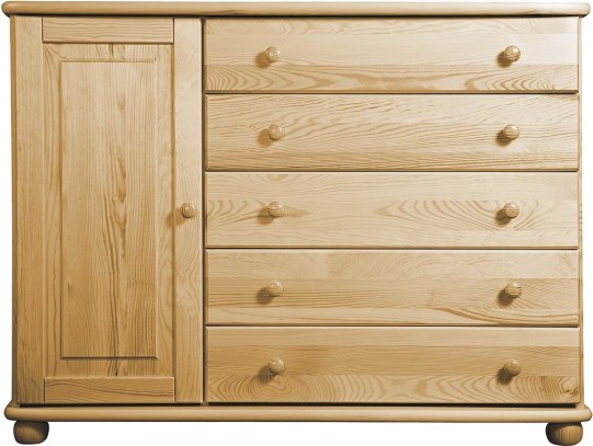 Komoda je vyrobená z borovicového masivu, které je ošetřeno dvěma vrstvami bezbarvého ekologického laku. Tyto solitéry jsou celomasivní, tzn. všechny části jsou vyrobeny z přírodního masivu, včetně bočnic a korpusů šuplíků. Dna šuplíků a záda jsou vyrobeny z bílého sololitu tl.0,5 mm. Komoda se dodává ve složeném stavu.