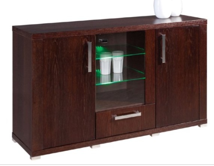 Komoda je vyrobena z masivu v barevném provedení wenge. Obsahuje jednu zásuvku, dvoje dvířka a dvě skleněné police.  Má decentní nožičky. Úchytky jsou kovové. K této skříní lze nakombinovat další komponenty ze systému REMI. Skříň je elegantní a  praktické. Možnost výběru z několika odstínů moření dřeva. Vámi zvolenou variantu moření uveďte v objednávce.