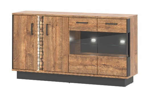 Moderní komoda s vitrínou v provedení dub april/černý. Korpus má vyrobený z lamina o síle 16 mm a MDF o síle 16 mm, ohraněný ABS 0,5 mm / 1,5 mm. Dvířka jsou vyrobeny z MDF o síle 18 mm a jsou potaženy PVC folií. Vrchní desky korpusu jsou vyrobeny z lamina o síle 22 mm. Vnitřní poličky jsou vyrobeny z lamina o síle 16 mm a ABS 0,5 mm. Nohy a úchytky jsou kovové. Zásuvky s kuličkovými pojezdy( GTV) jsou plným výsuvem. Systém tichého dovírání dvířek ve standardu, panty ⌀ 35 mm jsou nastavitelné ve třech osách. Ozdobné rylování je osvětleno LED osvětlením. Zboží je dodáváno v demontu.
