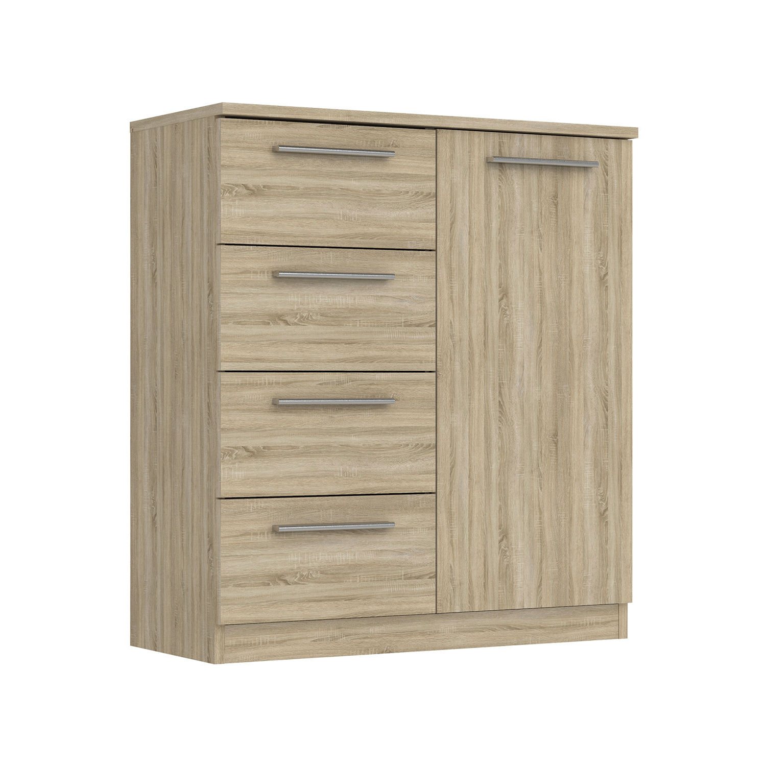 Komoda z lamina v barevném provedení dub sonoma. Komoda má 1 dveře a 4 zásuvky s kovovými pojezdy. Zboží dodáváme v demontu.