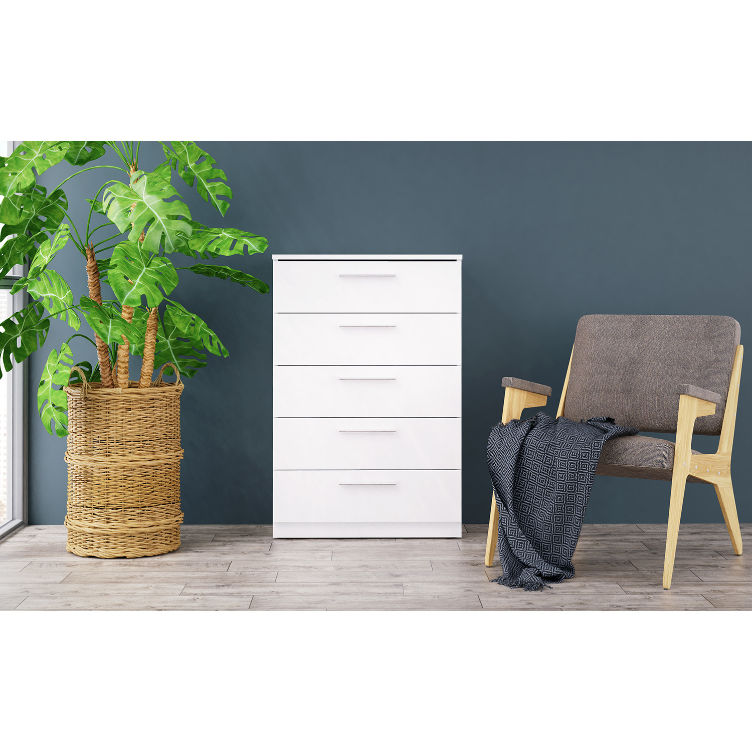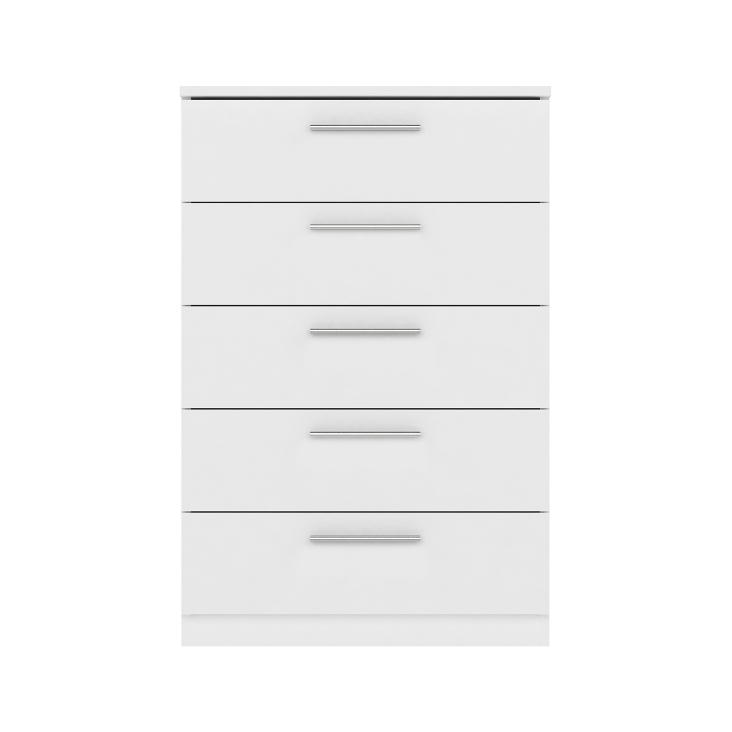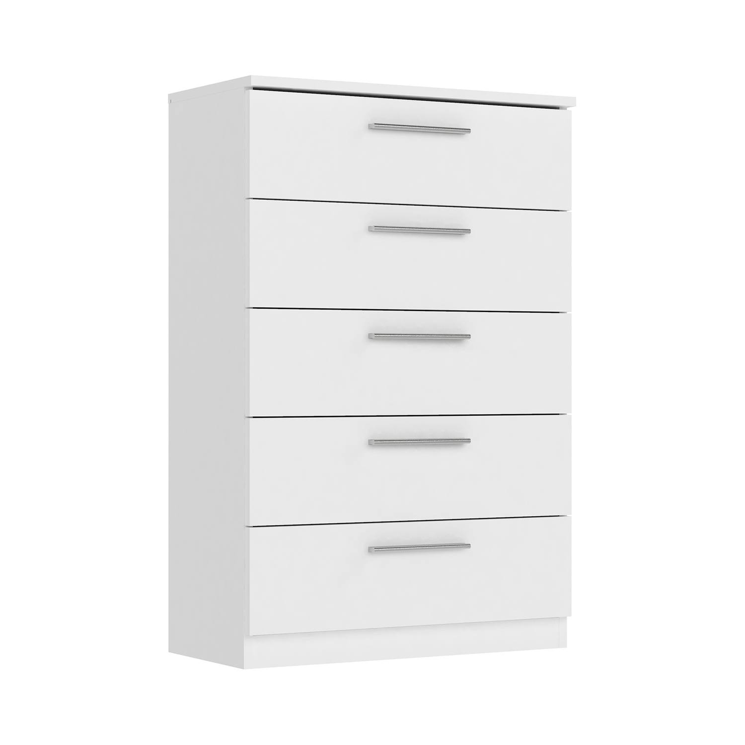 Komoda z lamina v barevném provedení bílá s 5 zásuvkami s kovovými pojezdy. Zboží dodáváme v demontu.