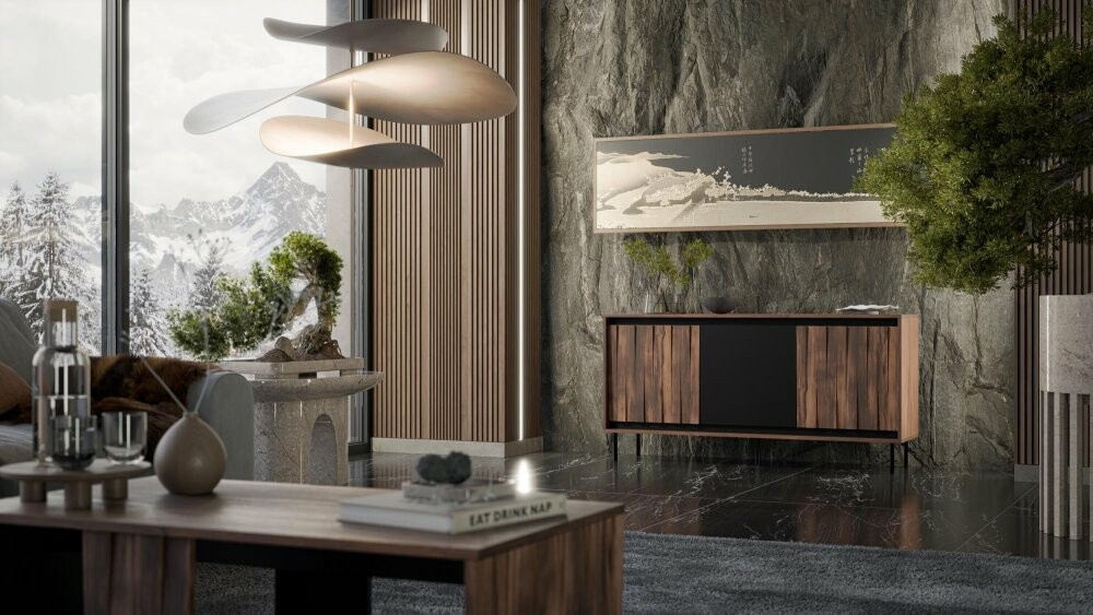 Komoda je vyrobena z laminované desky, foliované MDF a oceli s práškovým nástřikem. Barva kombinuje ořech a černou, a 3D struktura dodává komodě zajímavý vzhled. Zboží dodáváme v demontu.