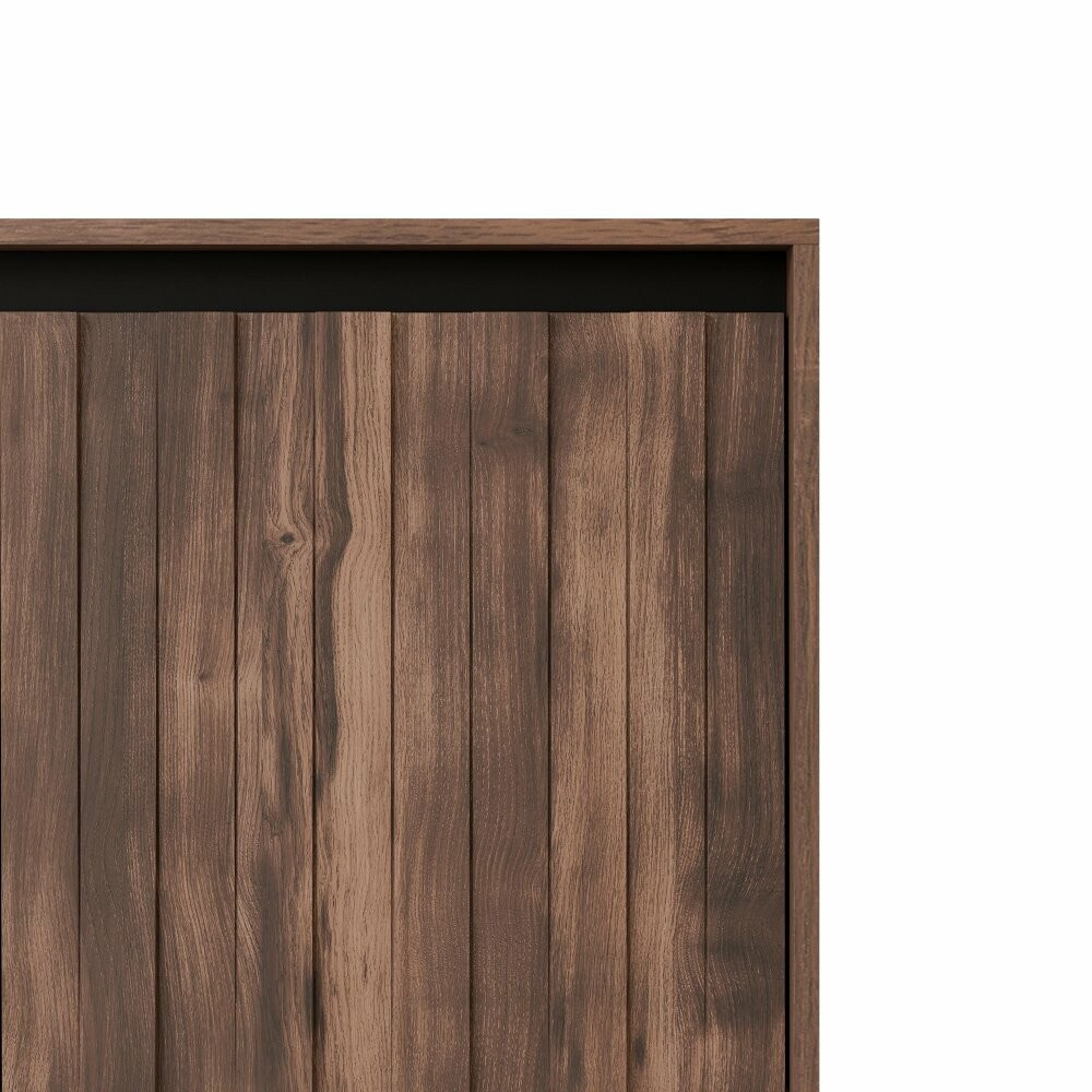 Komoda je vyrobena z laminované desky, foliované MDF a oceli s práškovým nástřikem. Barva kombinuje ořech a černou, a 3D struktura dodává komodě zajímavý vzhled. Zboží dodáváme v demontu.