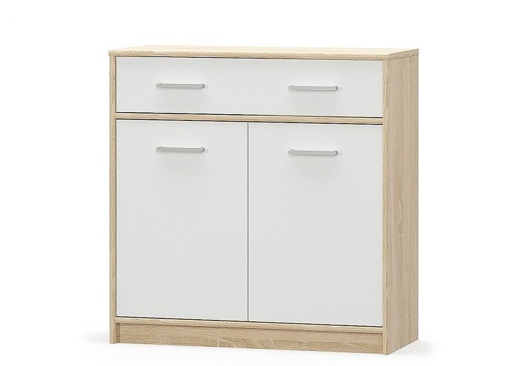 Kombinovaná komoda Tips 2D1S je vyrobená z lamina o síle 16 mm. Komodu se 2 plnými dvířky a zásuvkou nabízíme v dezénu bílá/ dub sonoma. Hrany lamina chrání ABS o síle 0,5mm. Pojezdy zásuvky jsou kovové, úchytky plastové. Komodu můžete libovolně kombinovat s ostatním nábytekm této kolekce. Nábytek TIPS je určen do předsíně, obývacího nebo studentského pokoje. Zboží dodáváme v demontu.