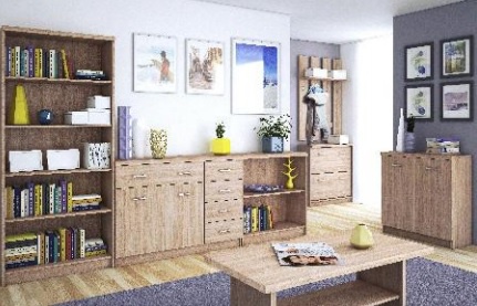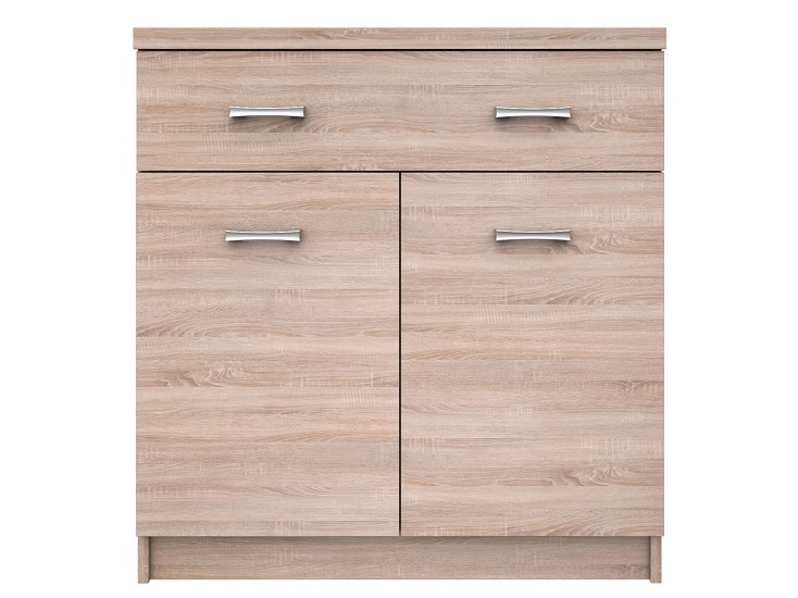 Kolekce TOP MIX je vyrobena z LDT desky 16 mm s ABS hranou. Úchytky jsou plastové a pojezdy šuplíků kovové. Dodává se ve dvou barevných variantách: dub sonoma nebo kombinace bílé a dubu sonoma. Komoda má dvoje dvířka a jeden šuplík. Zboží je dodáváno v demontu.