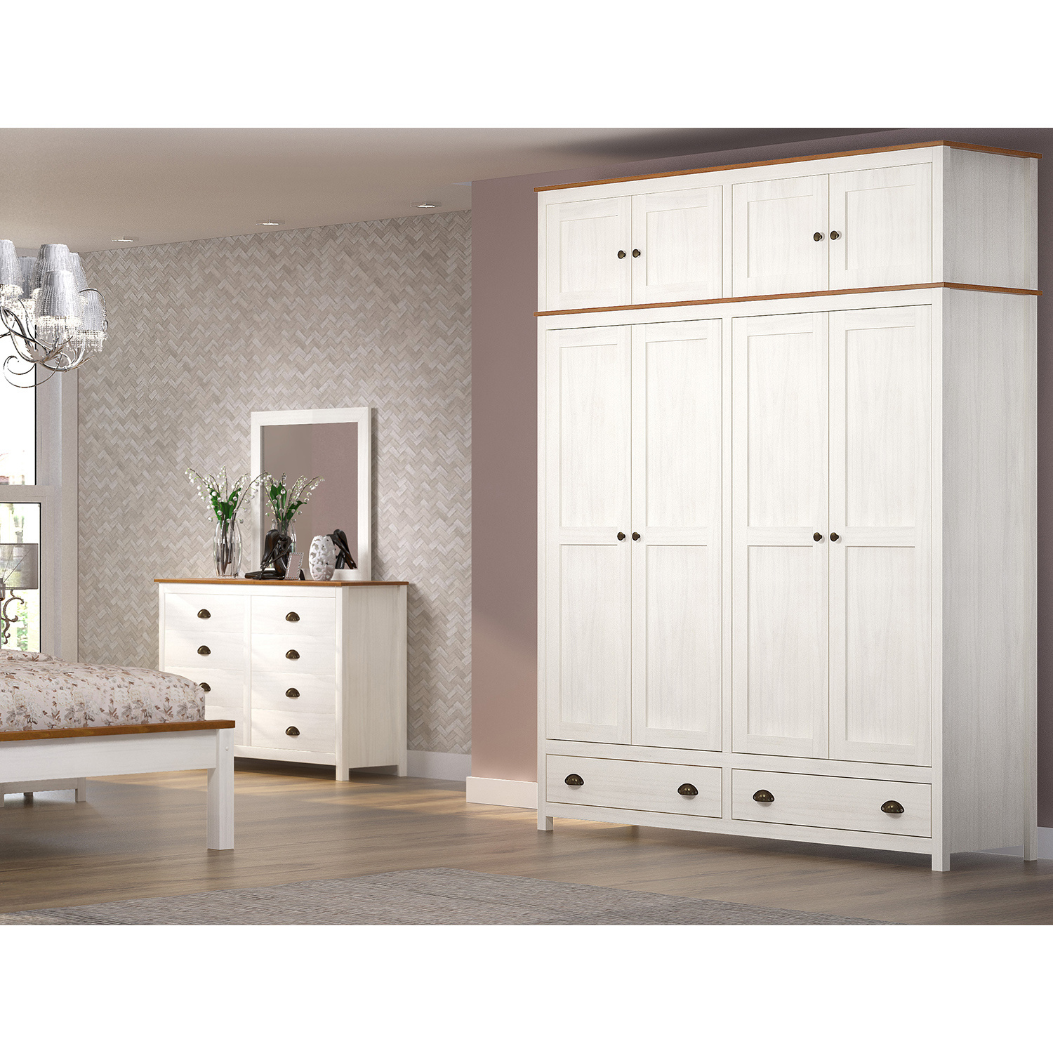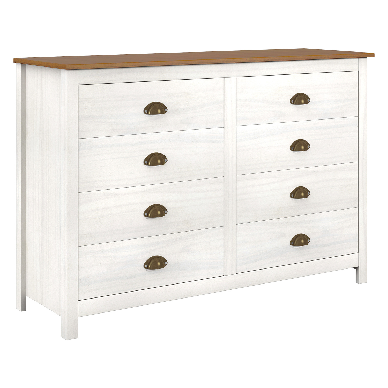 Komoda TOPAZIO z masivu borovice v matném provedení bílá/hnědý lak.. Masivní komoda má osm zásuvek s kovovými pojezdy, takže jako prádelník poslouží na jedničku. Komoda má zásuvky s výraznými kovovými úchytkami. Zboží je dodáváno v demontu.