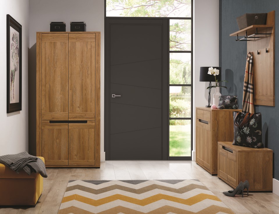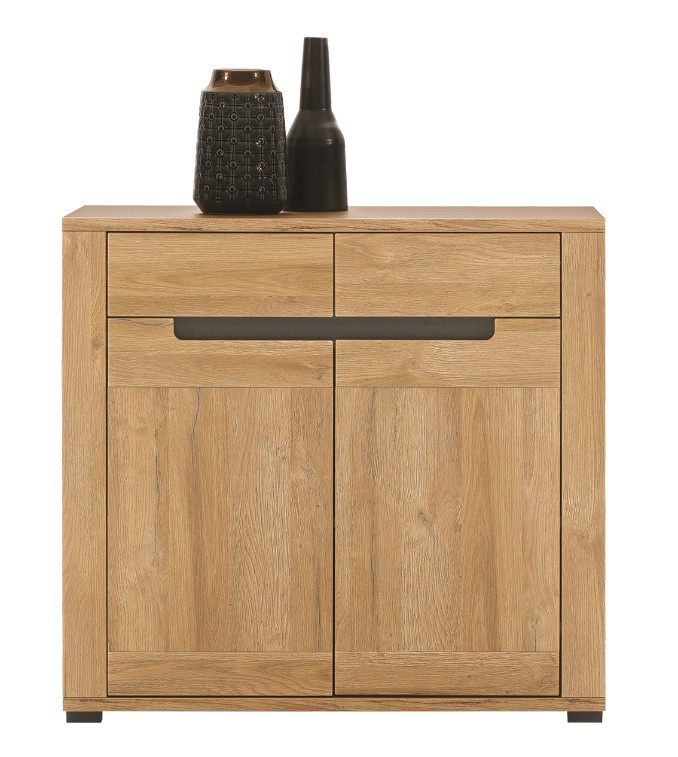Komoda má korpus vyroben z lamina a MDF o síle 16 mm, s ABS hranami. Dvířka z lamina 16 mm a MDF 18 mm v provedení dub granson/ grafit. Horní deska korpusu je silná 22 mm . Nábytek má plastové nožky a bezúchytkový systém otvírání dvířek. Zboží je dodáváno v demontu.