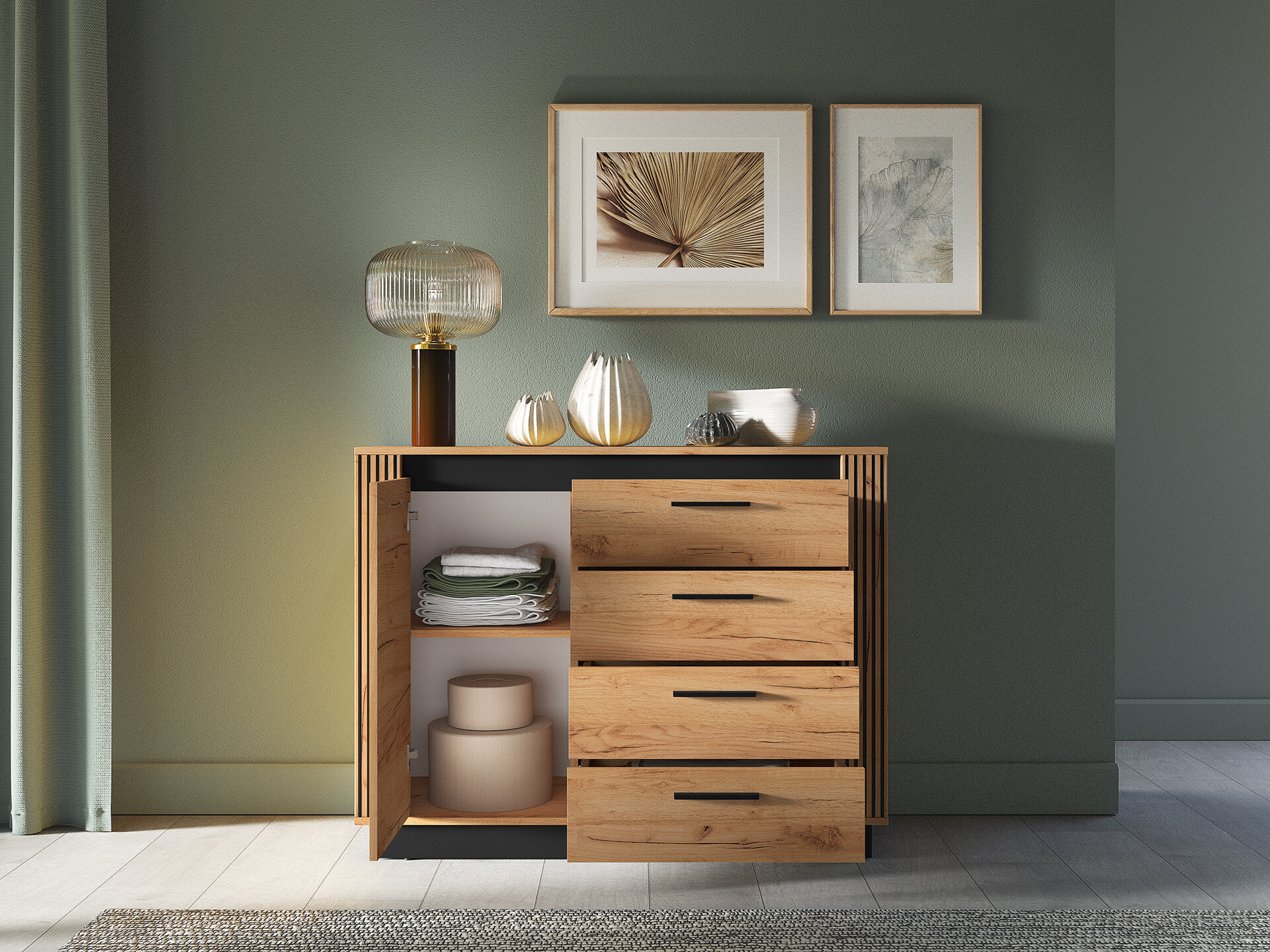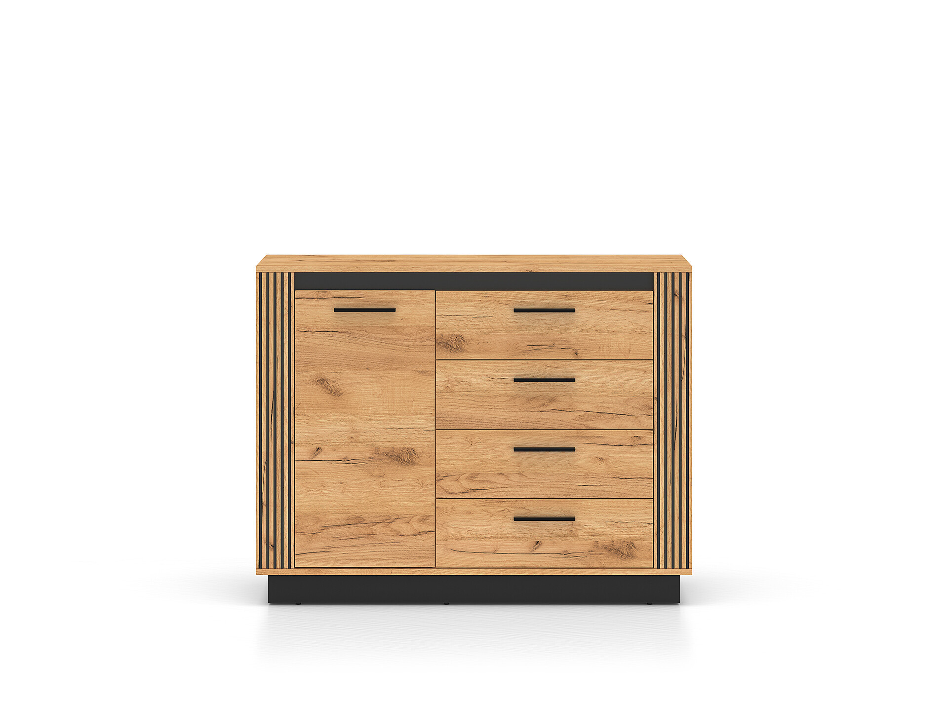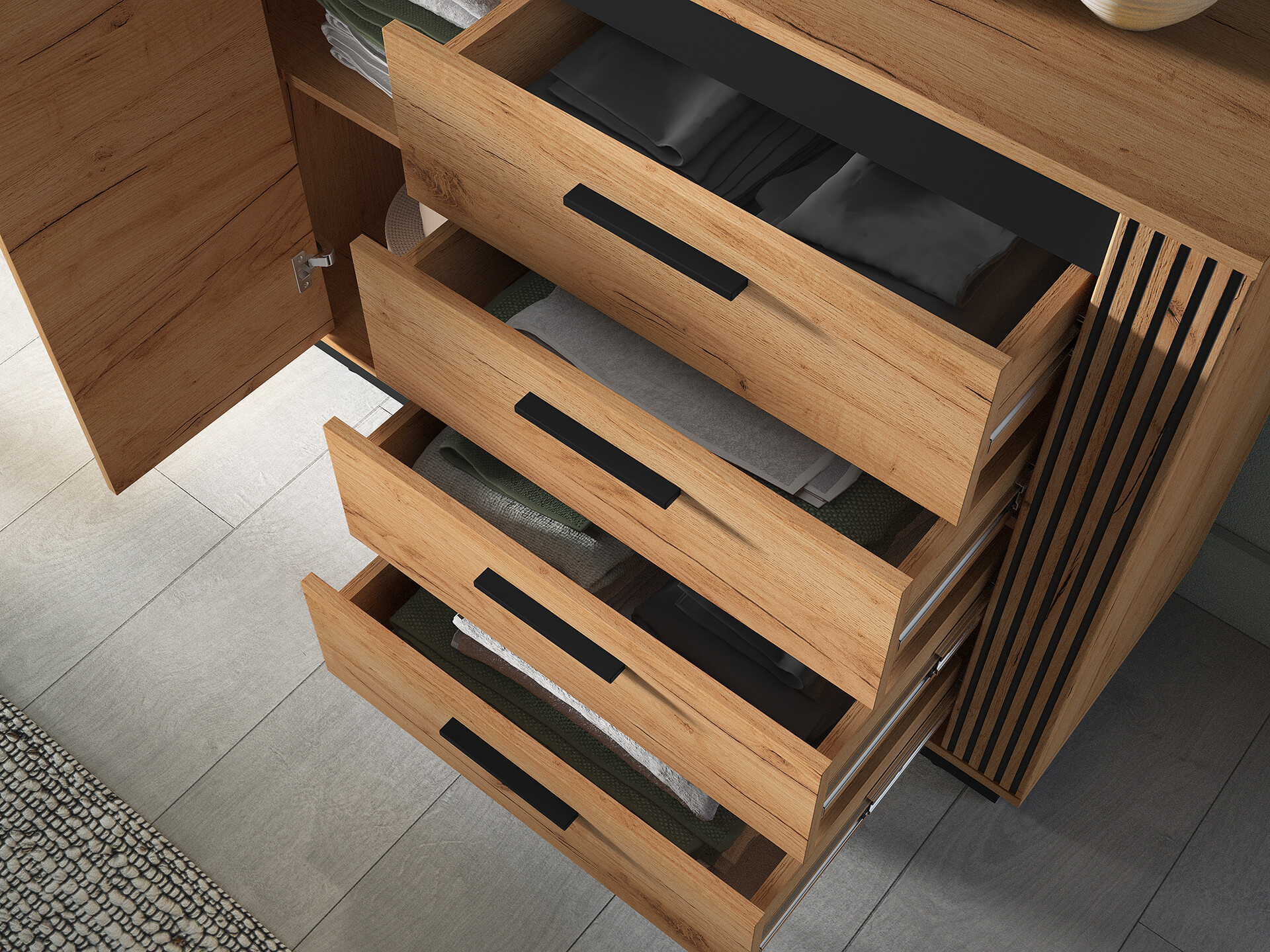 Komoda Urso je vyrobena z vysoce kvalitní laminované dřevotřískové desky s ABS hranou v provedení dub craft zlatý/ černá. Zboží dodáváme v demontu.