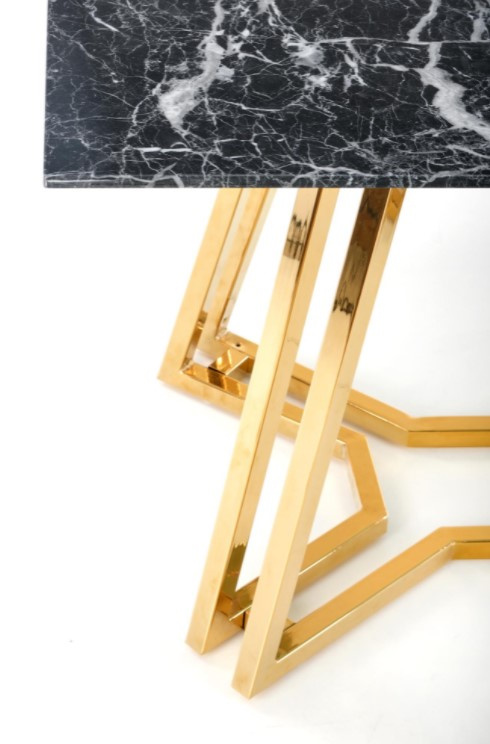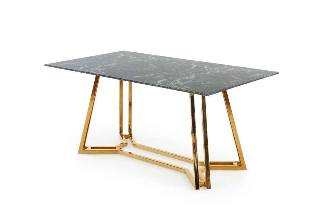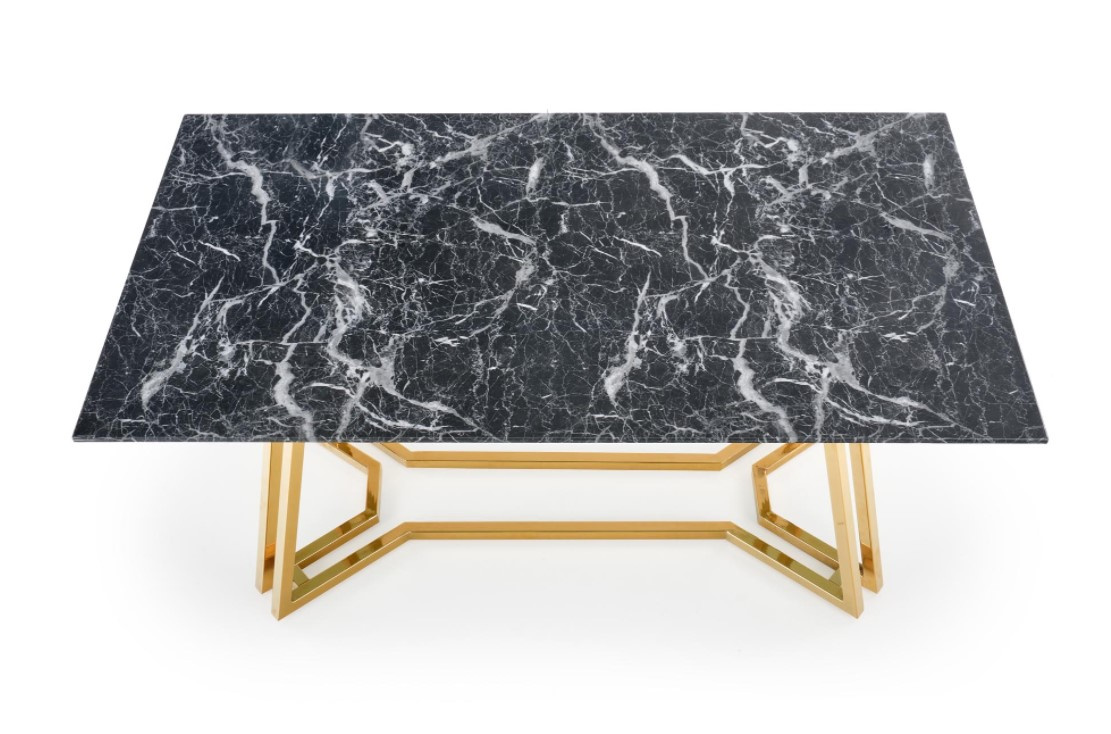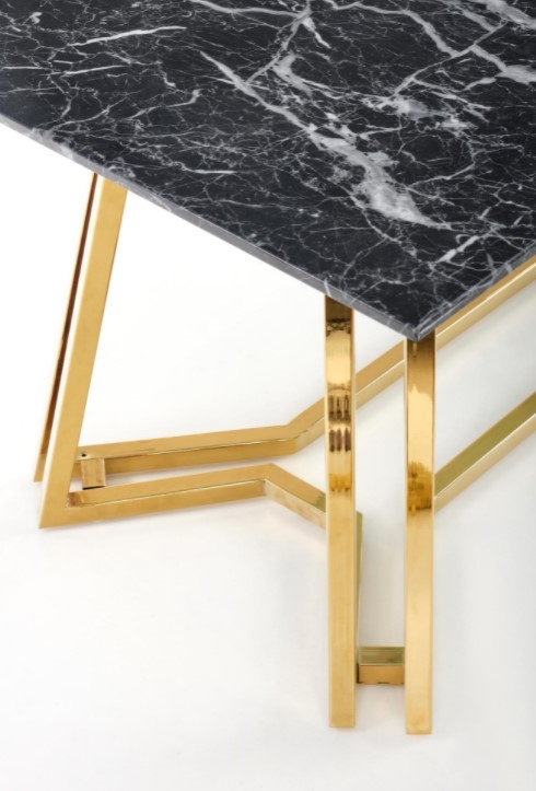 Jídelní stůl obdélníkový je vyroben v kombinaci materiálu sklo/ocel chromovaná. Horní deska stolu je v barvě černý mramor, kostra stolu je v barvě zlaté. Zboží dodáváme v demontu. Foto je ilustrační, židle nejsou součástí produktu.
