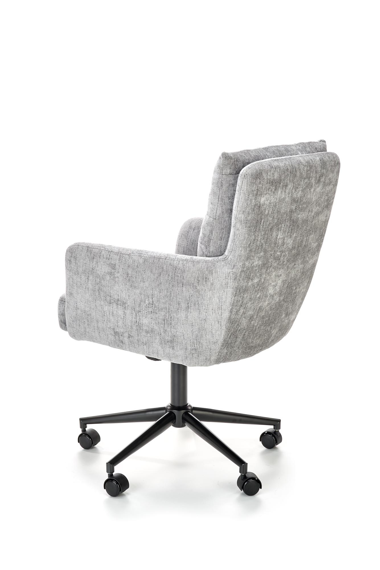 Otočne křeslo Flores je potaženo látkou v barevném provedení šedá a stojí na stabilním kovovém pětiramenném kříži s plastovými kolečky.