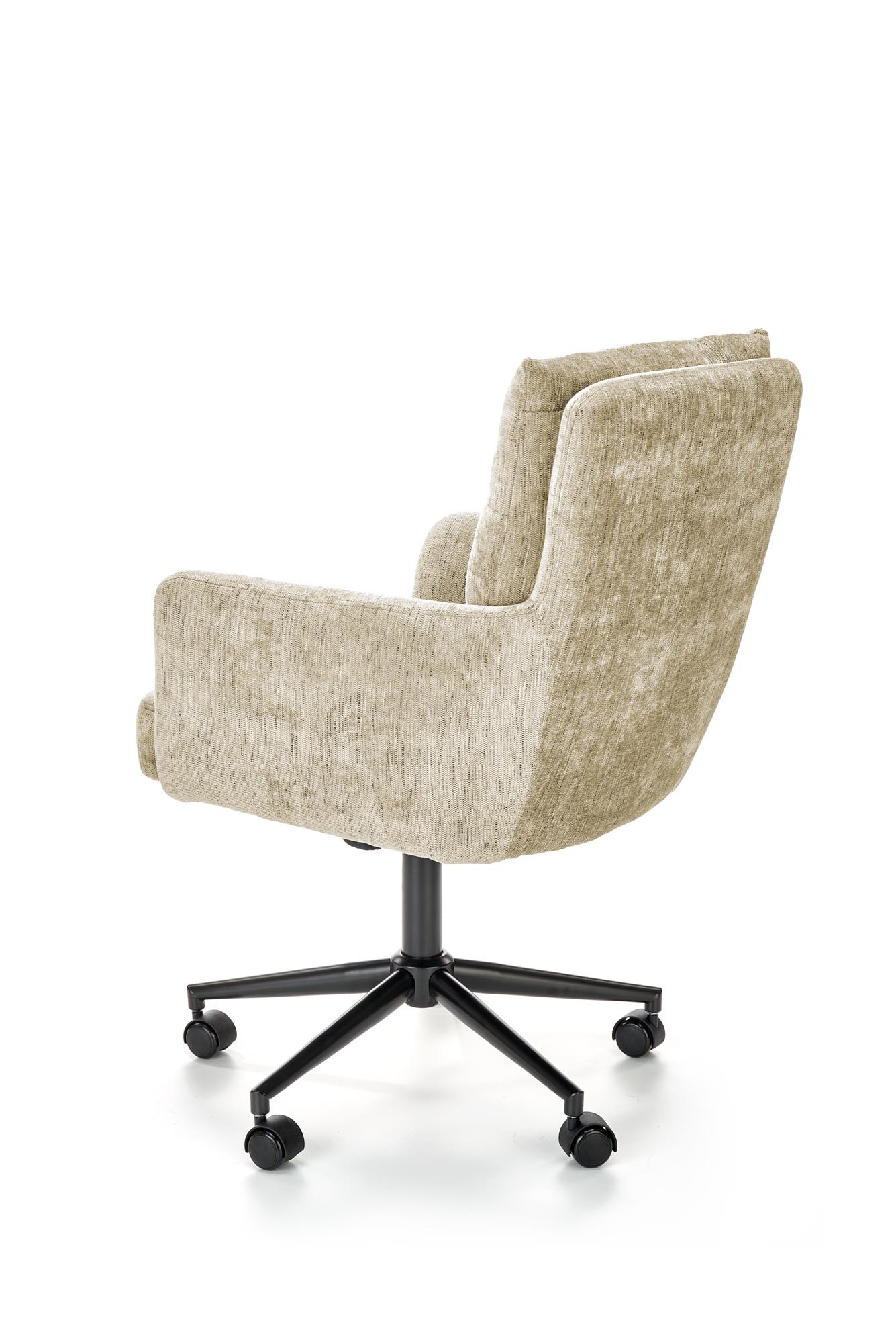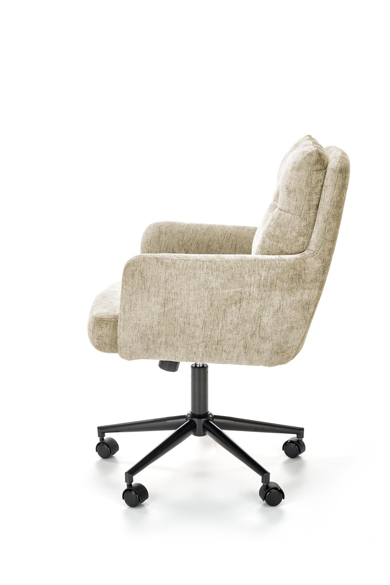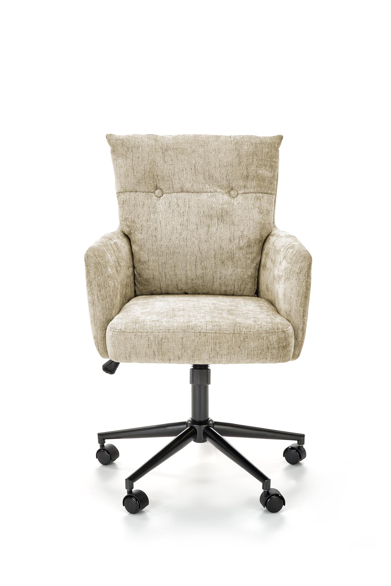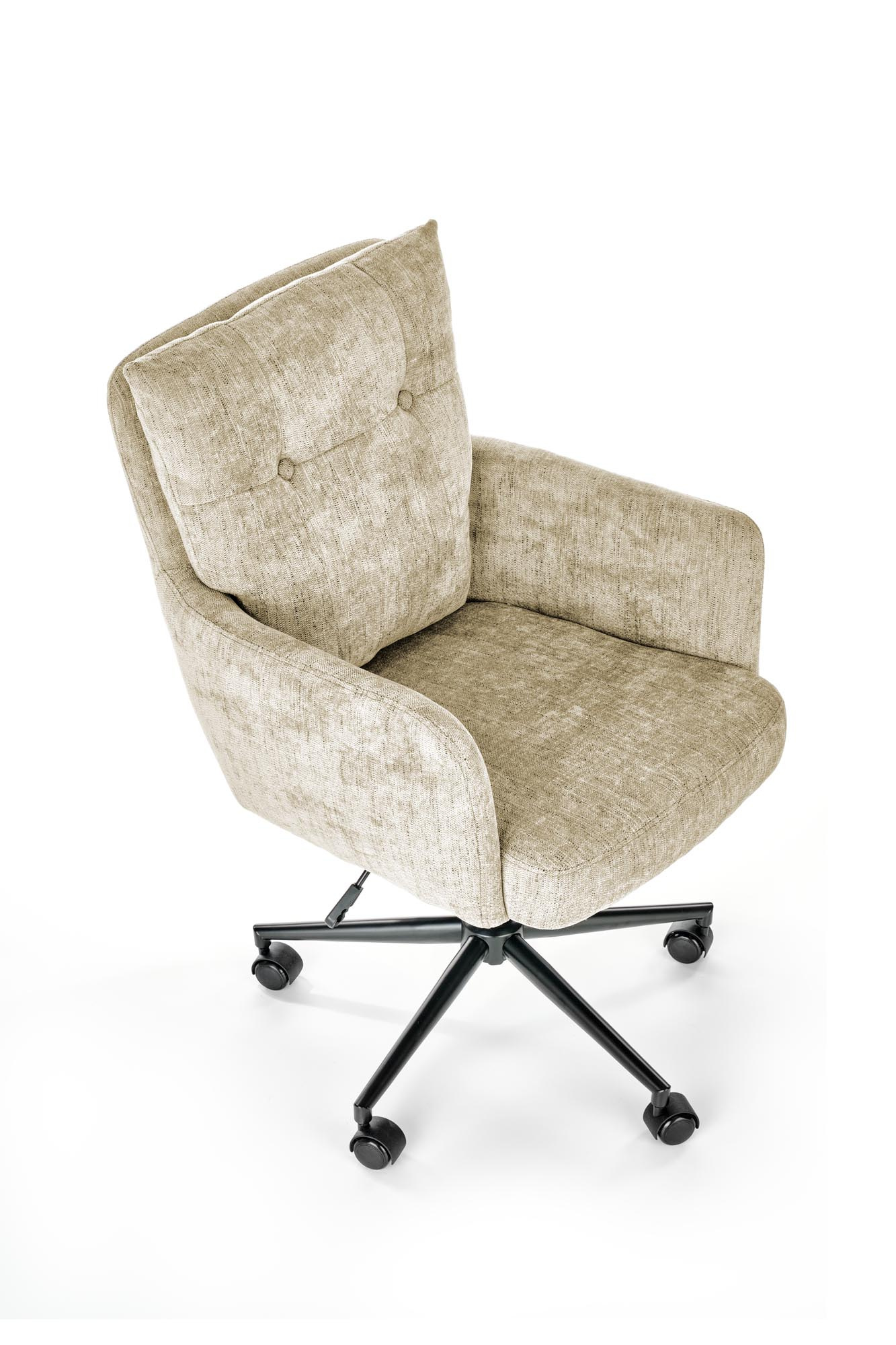 Otočne křeslo Flores je potaženo látkou v barevném provedení světle hnědá a stojí na stabilním kovovém pětiramenném kříži s plastovými kolečky.