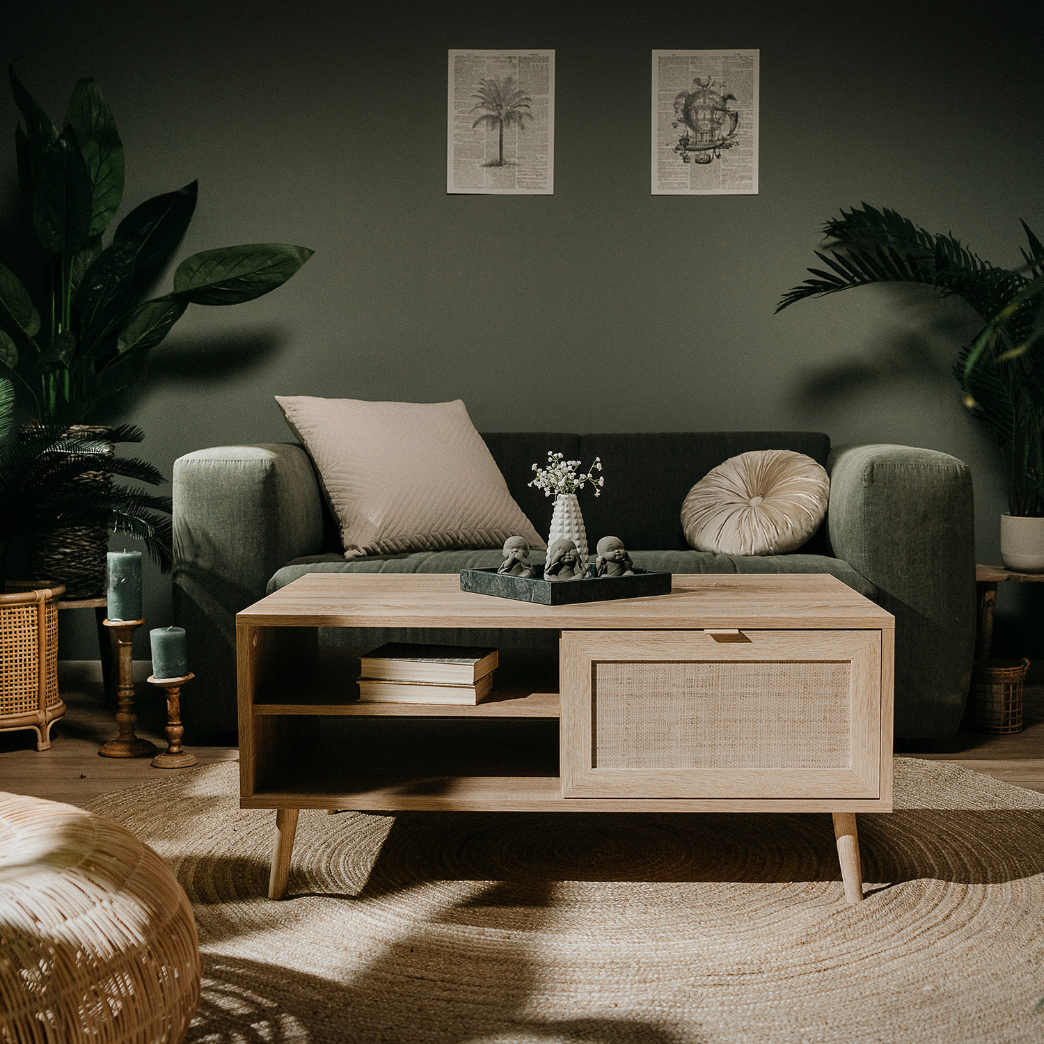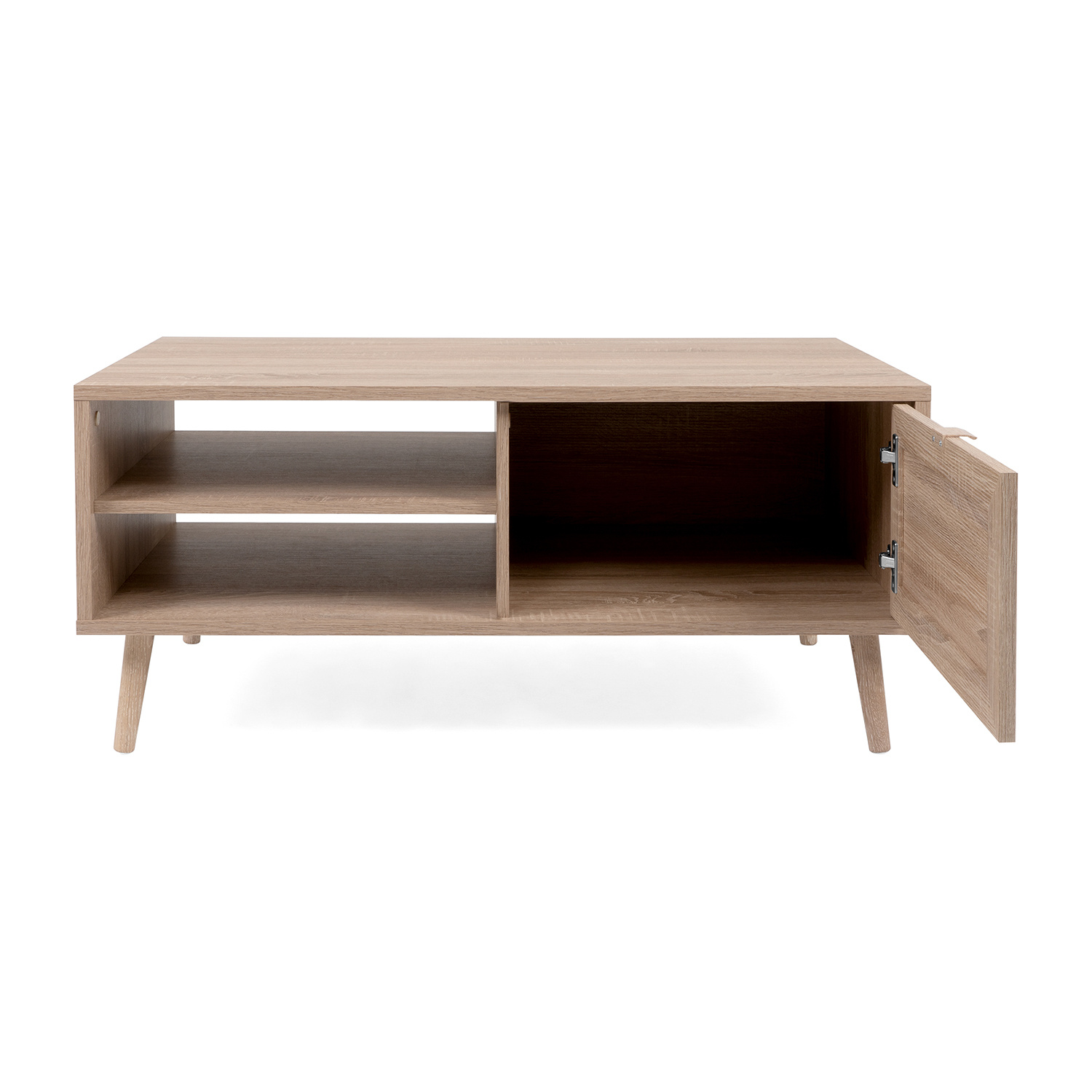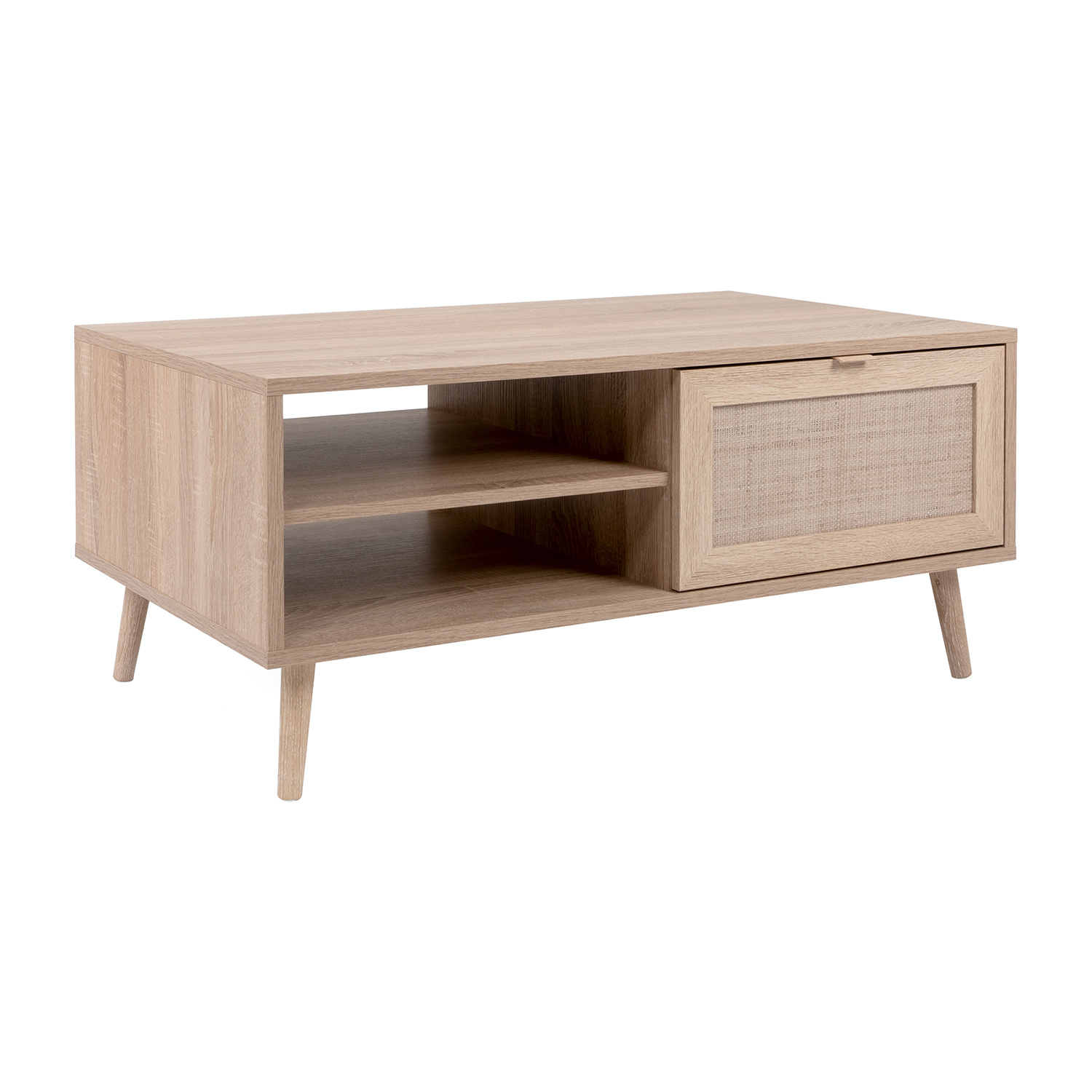 Konferenční stolek z lamina má nohy z masivu. Stolek v barevném provedení dub sonoma, dveře imitace lýkového výpletu. Stolek má 2 otevřené police, 1 malá dvířka. Zboží dodáváme v demontu.