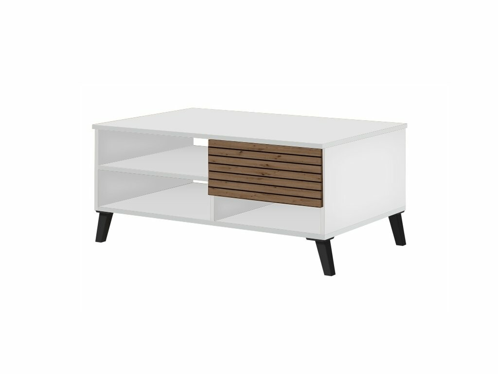 Konferenční stolek ze systému CARLO má kontrukci vyrobenou z kvalitního lamina s ABS hranami v matné bílé barvě. Dekorativní prolis na čelní ploše je v dekoru dub flagstaff. Nožky a úchytky  jsou kovové v černé barvě. Konferenčí stolek má 3x police a 1x zásuvka. Zboží dodáváme v demontu.
