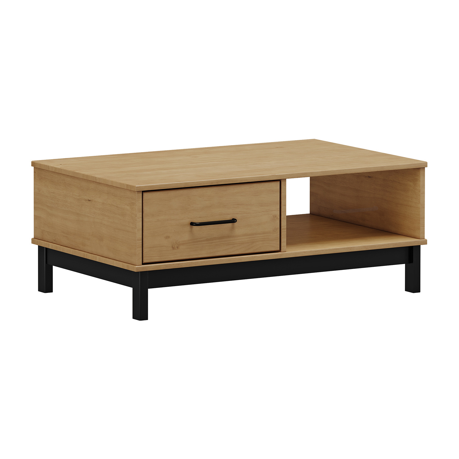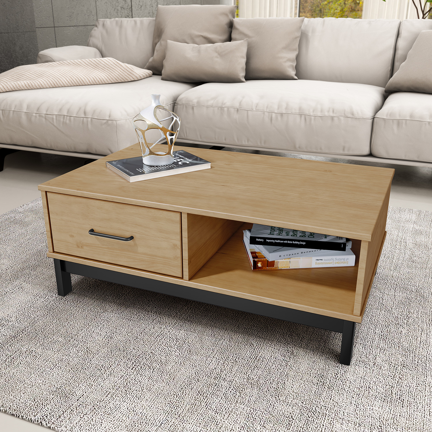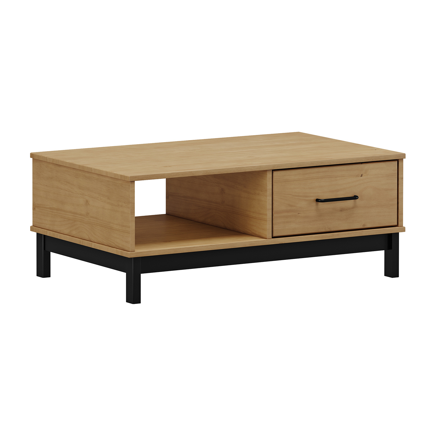 Konferenční stolek v barevném provedení buk/ černé nohy. Stolek s 1 otevřenou policí a 1 malými dvířky. Zboží dodáváme v demontu.