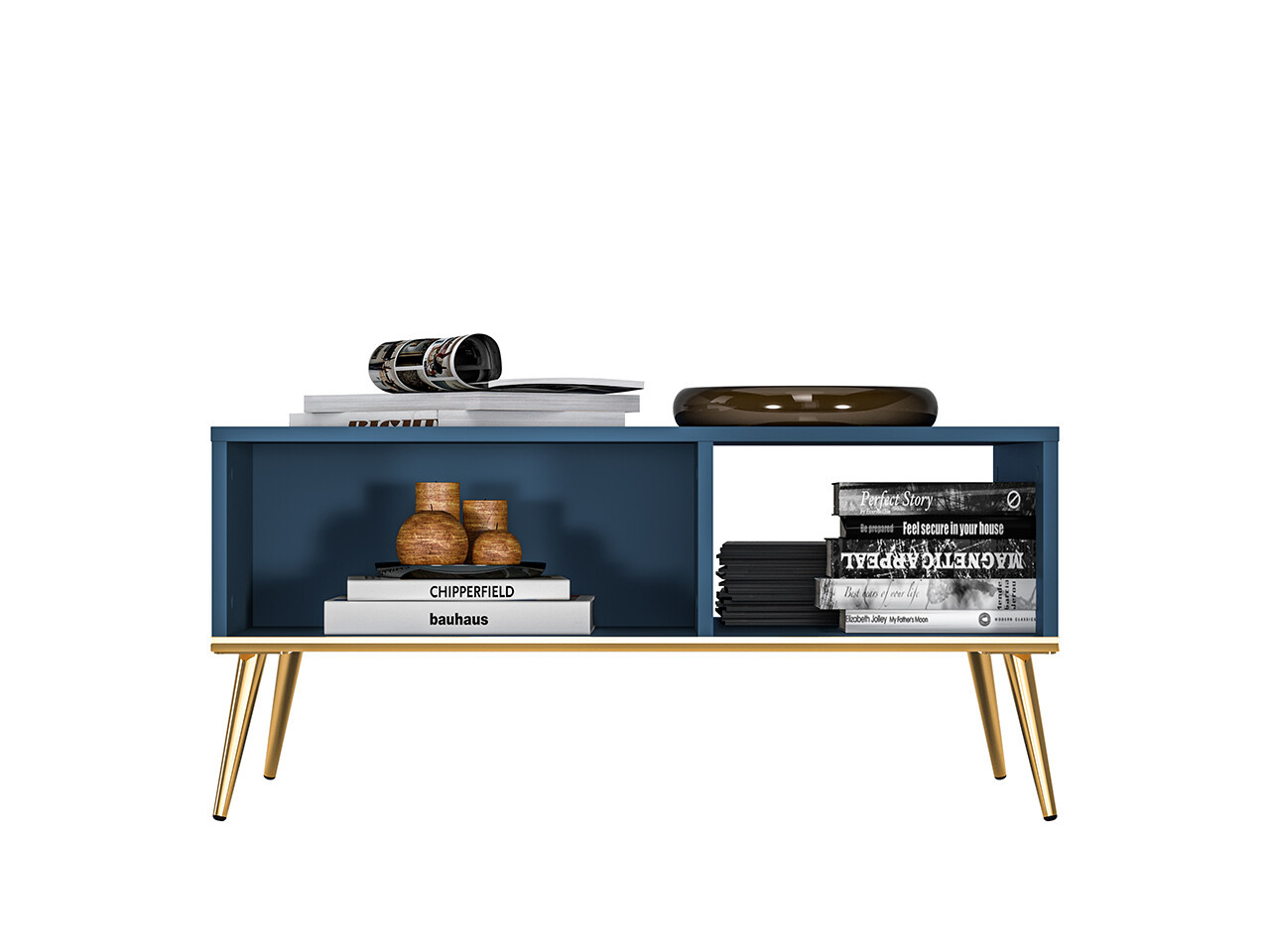 Konferenční stolek Marine je vyrobena z vysoce kvalitní laminované dřevotřískové desky s ABS hranou v modré barvě. Stabilní vysoké nohy v kovovém provedení a dvojitě pozinkovaná rukojeť jsou ve zlatém provedení. Zboží dodáváme v demontu.
