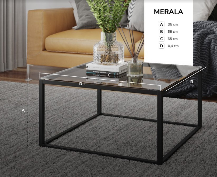 Čtvercový konferenční stolek MERALA je vyroben v kombinaci skleněné desky a černých ocelových nohou. Tloušťka skleněné desky je 4 mm. Jeho neutrální vzhled ho předurčuje do obývacího pokoje v moderním nebo minimalistickém stylu. Zboží je dodáváno v demontu.