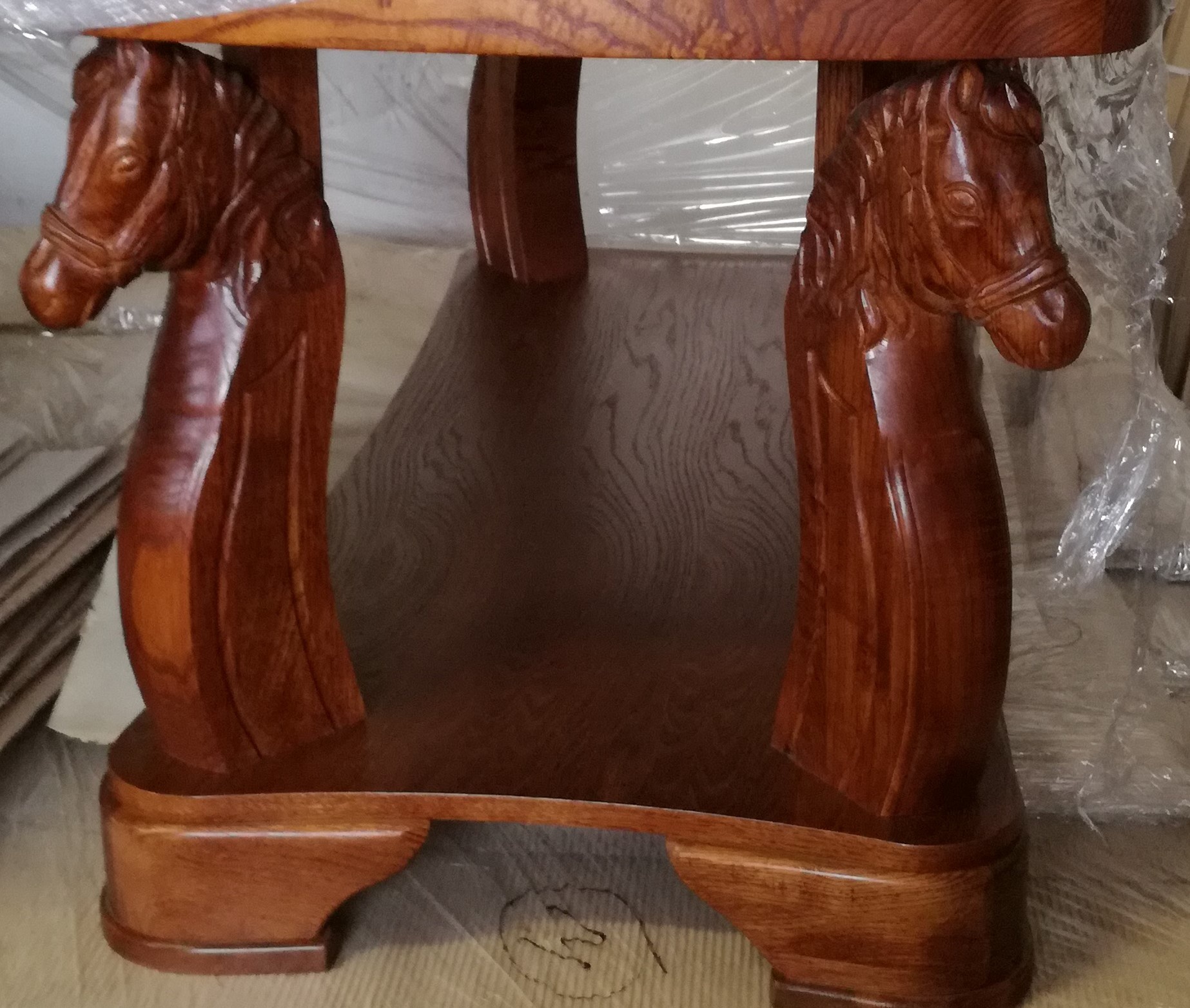 Konferenční stolek je vyroben z kvalitního dubového masivu, na vrchní desce je však tenká vrstva dýhy, díky které je povrch stolku odolnější. Tento luxusní stolek nadchne nejen milovníky koní, ale také milovníky luxusního rustikálního nábytku. Zaujme na první pohled krásným luxusním zpracováním. Mezi vrchní a spodní deskou, která je na ozdobných nožkách, jsou napůl ručně vydlátovány a napůl vyfrézovány strojem hlavy čtyř koní, kteří tomuto konferenčnímu stolku dodávají eleganci, styl a originalitu. Možnost výběru z několika odstínů moření dřeva. Vámi zvolenou variantu moření uveďte v objednávce.