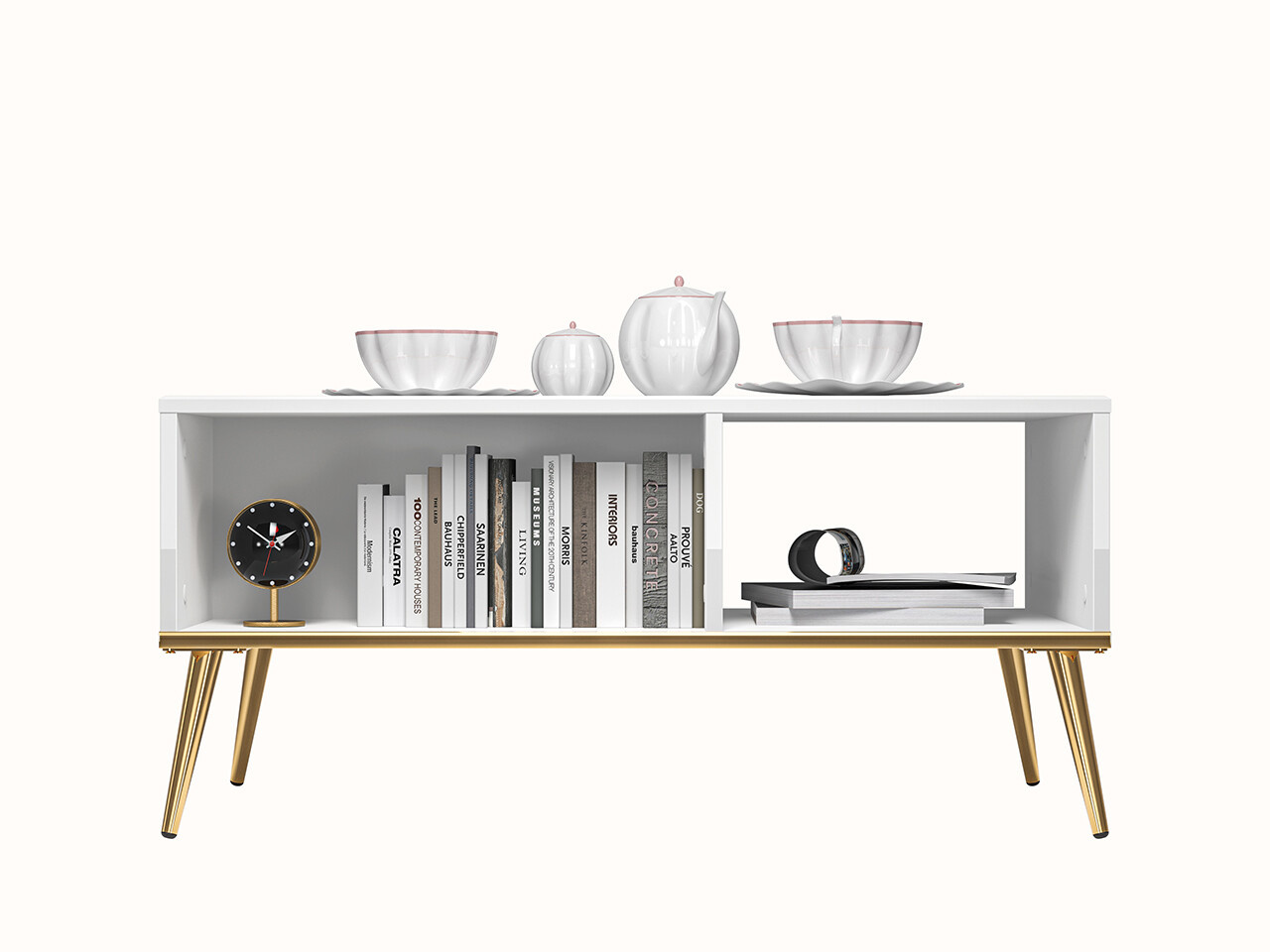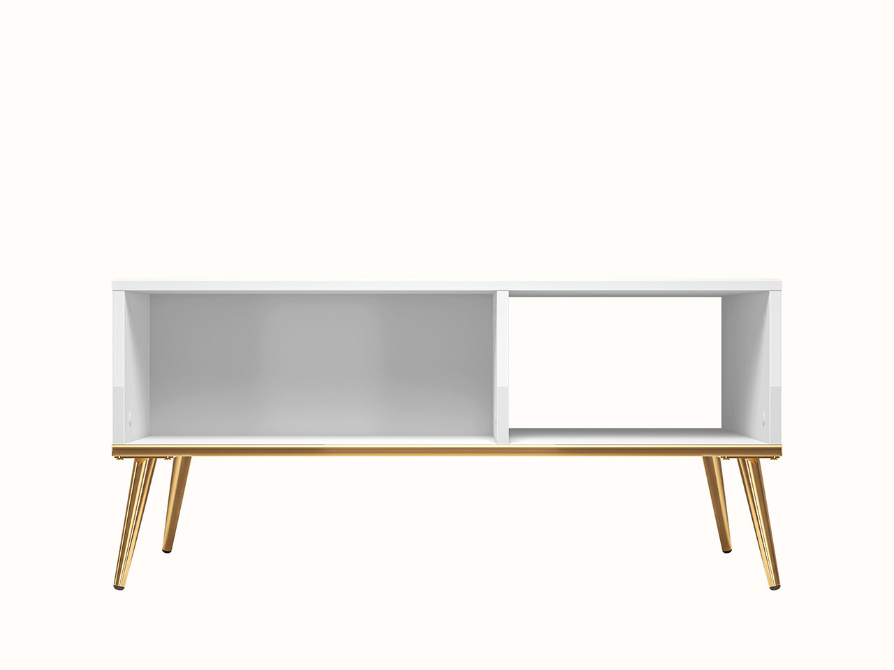 Konferenční stůl Goldin je vyrobena z vysoce kvalitní laminované dřevotřískové desky s ABS hranou korpus v  dezénu bílá/ bílá lesk. Úchytky a nožka jsou kovové v zlaté barvě. Skříňky i zásuvky jsou vybaveny systémem tichého zavírání, který zajistí plynulé a nehlučné zavírání dvířek. Zboží dodáváme v demontu.